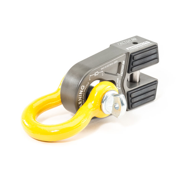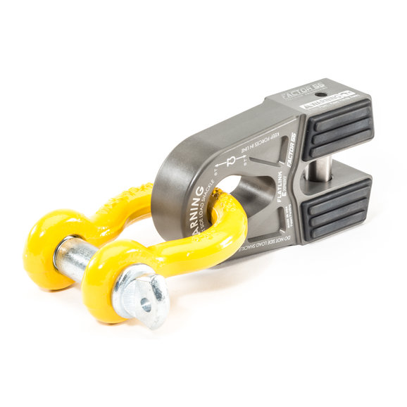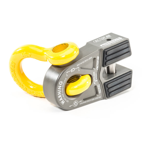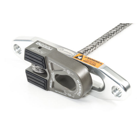 Conventional winch hooks can cut and fray recovery straps and often allow strap ends to escape during momentary slack cycles of a typical winching recovery. Screw pin shackles do not allow strap loops to escape due to their secure screw pin attachment. The FlatLink E does not require splicing and is compatible with steel cables or synthetic ropes up to 3/8 inches in diameter. The cable eye is retained in the FlatLink E by a 5/8 inch diameter 6Al4V Titanium double shear pin and internal snap ring. Installation takes only minutes. The EPDM Rubber Guards protect alloy fairleads and are securely attached to the FlatLink E with 4 barbed tips each. The FlatLink E stows neatly against either roller or Hawse type fairleads and is designed to be used with common 3/4 inch shackles.