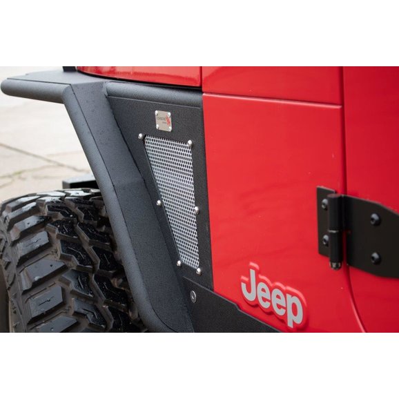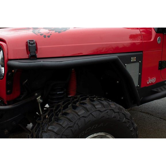The Fishbone Offroad Front Tube Fenders are a one-piece high-clearance fender and flare replacement for the Wrangler TJ. Made from steel and coated in a textured black powder coat finish, these fenders replace the original equipment. Featuring a removeable and paintable perforated mesh to promote air flow through the engine compartment, as well as a 3" flare extension for wider coverage protecting the body from flying debris. Includes stainless steel hardware for a clean installation.