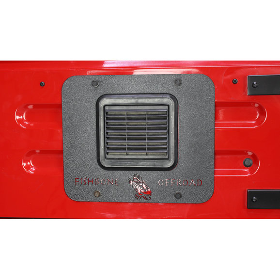 So you've taken off your spare tire. That got rid of some weight, maybe gave a little bump in MPGs, and better rear visibility. But now what to you do with that cabin exhaust vent? If you cover it up completely it might cause issues with airflow with the top down, doors off, or when running the heating and air conditioning systems. Why not add a little style? That's why Fishbone Offroad made their Backside Tailgate Cover with Vent Hole. The aluminum plate is precisely laser-cut ensuring a perfect fit on 97-06 Wrangler TJ models. Features textured black powder coat finish, laser etched Fishbone Offroad logo, and included plastic body plug.