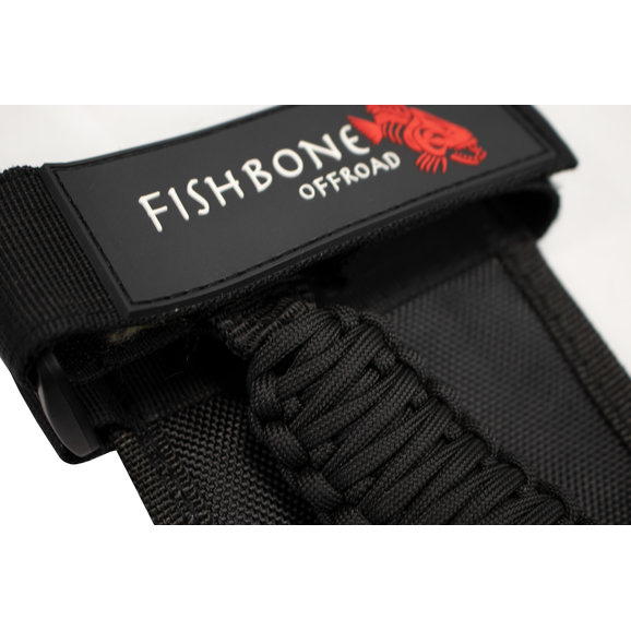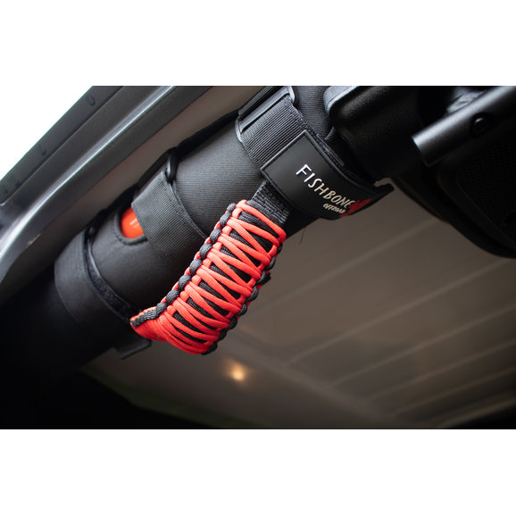 The Jeep Wrangler was built for off-roading, but forgot some of the small details. The Fishbone Offroad Paracord Grab Handle Set, made for any Wrangler with round sport bar, provides a convenient and stylish answer to question of where to grip when you are traveling over rough terrain. 550 nylon paracord is decoratively wrapped around a woven nylon strap for a comfortable grip. Easily attaches around the roll bar with adjustable hook and loop straps and is available in Black or Red to complement your style.