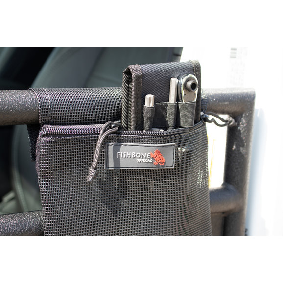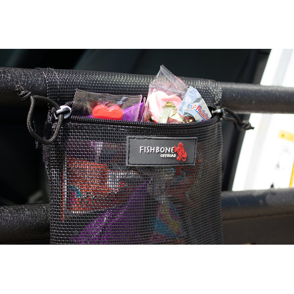 The Fishbone Off Road Tube Door Mesh Storage Pouch is the perfect solution for providing extra storage when you have your tube doors on your Jeep. This mesh-vinyl pouch simply loops around the tubing and and secures your valuable with a double zipper. Measures 8" x 6.5" and expands to about 4" wide. Keep you small items secured and within reach.
