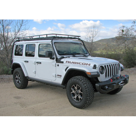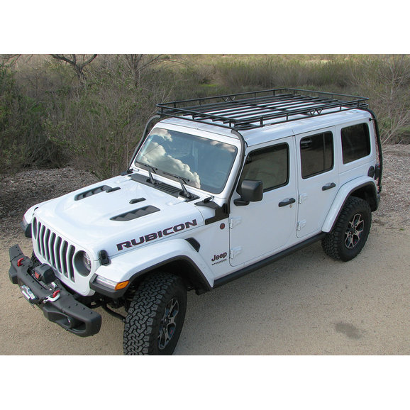 Camping, cycling, overlanding, wheeling, road trips to the beach or mountains, even a trip to the local hardware store. All these adventures may require your Jeep Wrangler JL to carry extra cargo. Adding cargo space is easy with the Garvin Expedition Full Rack! Measuring 54"W x 93.5"L by 4"H with a static (Parked) load limit of 600 lbs, and a dynamic (Moving) load limit of 300 lbs, this rack is sure to provide you with storage capacity you need. Up front, the rack mounts securely to your windshield brackets. In the rear, it mounts to the lower body of the Jeep. This rack utilizes a simple, bolt-on installation with no drilling required. The front of the rack sits 9" above the top of the factory rain gutter and 8.5" above the rear rain gutter. Enough clearance is built into the rack to allow the removal/installation of the Freedom Top panels without the need to remove the rack. Made from heavy-duty 1 1/4" square tubing. Works with crossbar kit part # 29210 and wind deflector part # 29964. Made in the USA!