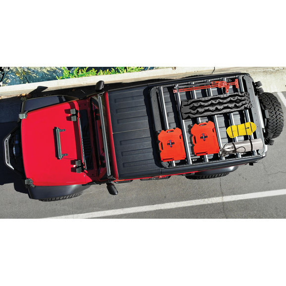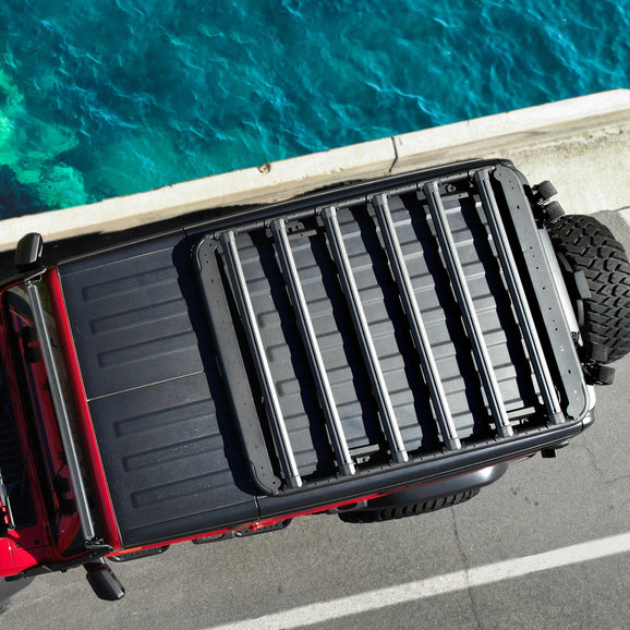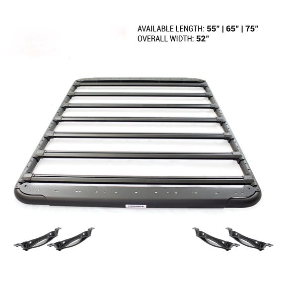 The Go Rhino SRM500 Flat Roof Rack is an innovated versatile Roof Rack for JK, JL, and Gladiator JT model Jeeps. SRM500 Flat Roof Racks feature a 2” diameter tubular low-profile flat rack that is packed with detail. With a full 52" width, choose from 55", 65" and 75" lengths with qty 4 crossbar Rhino Clamps included. The SRM500 low-profile creates a reliable platform for convenient gear storage no matter the size or shape. Aluminum slotted crossbars allow for tools and attachments to be mounted inside the rack. These Racks have an easy, quick assembly process and comes in a durable textured black powder coat finish.