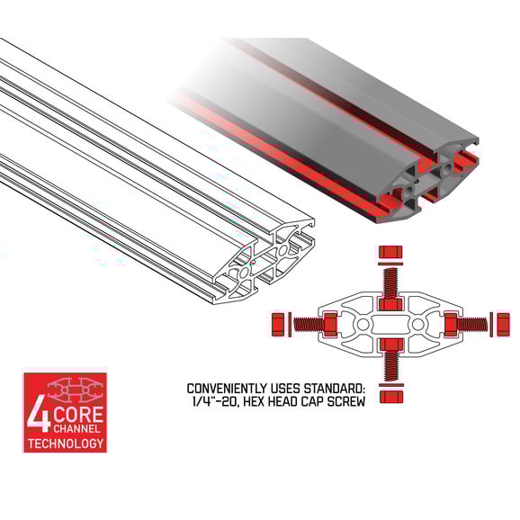 Channel Technology: Full length open channels for mounting a variety of accessories. Keyhole access to the channels allows use of standard hardware.