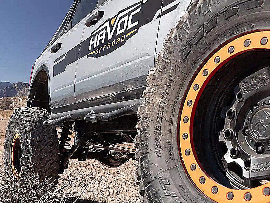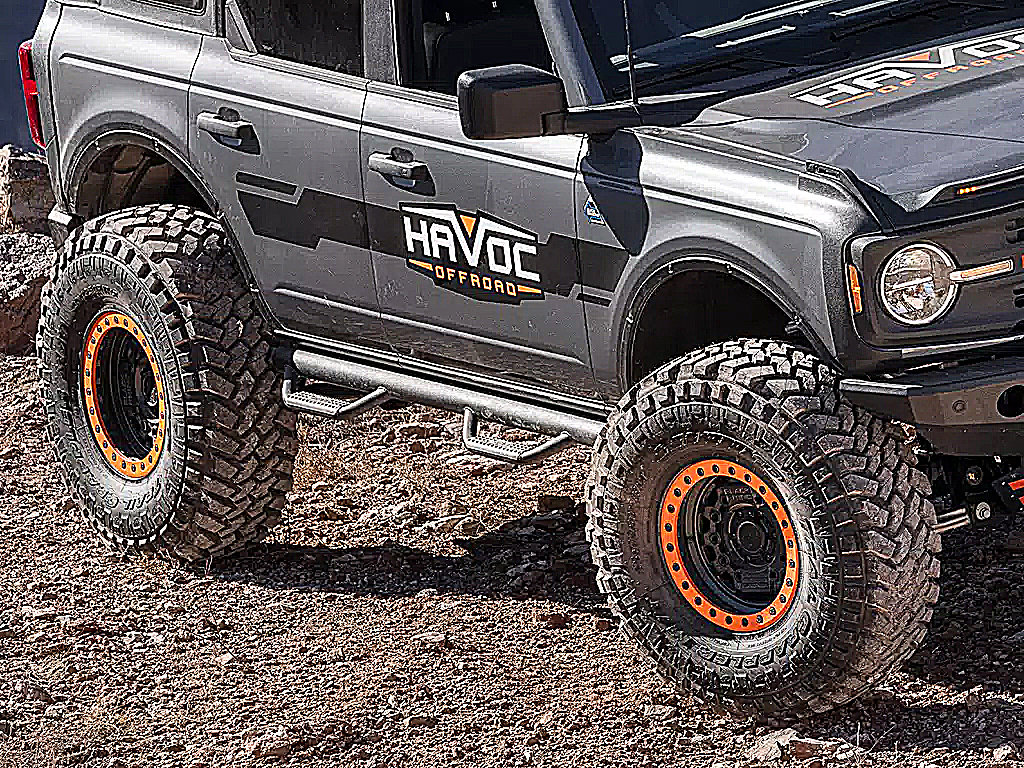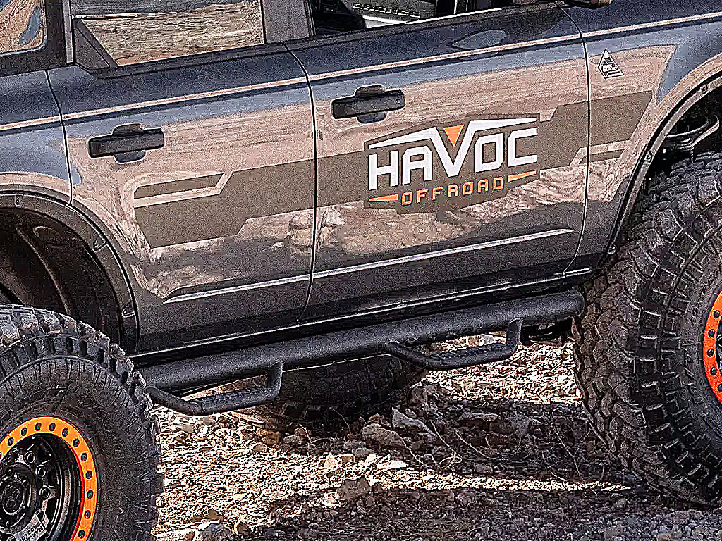 Improve your Bronco’s look and make vehicle entry and exit easier with the Havoc Offroad HN2 Nerf Bars. The primary tube is made from heavy-duty 3” O.D. carbon steel for rugged durability with an ergonomic hoop step at each door. The high and tight design offers a clean look for your Bronco, and these bars are finished in textured matte black powder coating for improved corrosion resistance. Installation is a bolt-on process with no drilling required, and these bars come backed by Havoc Offroad’s Five-Year Limited Warranty.