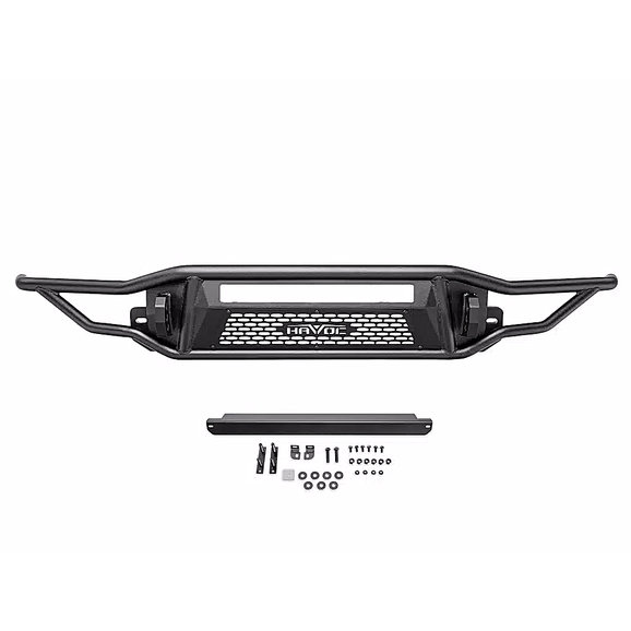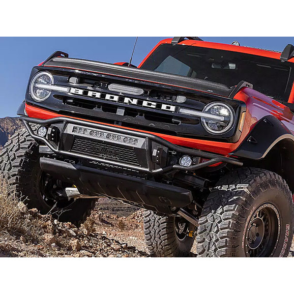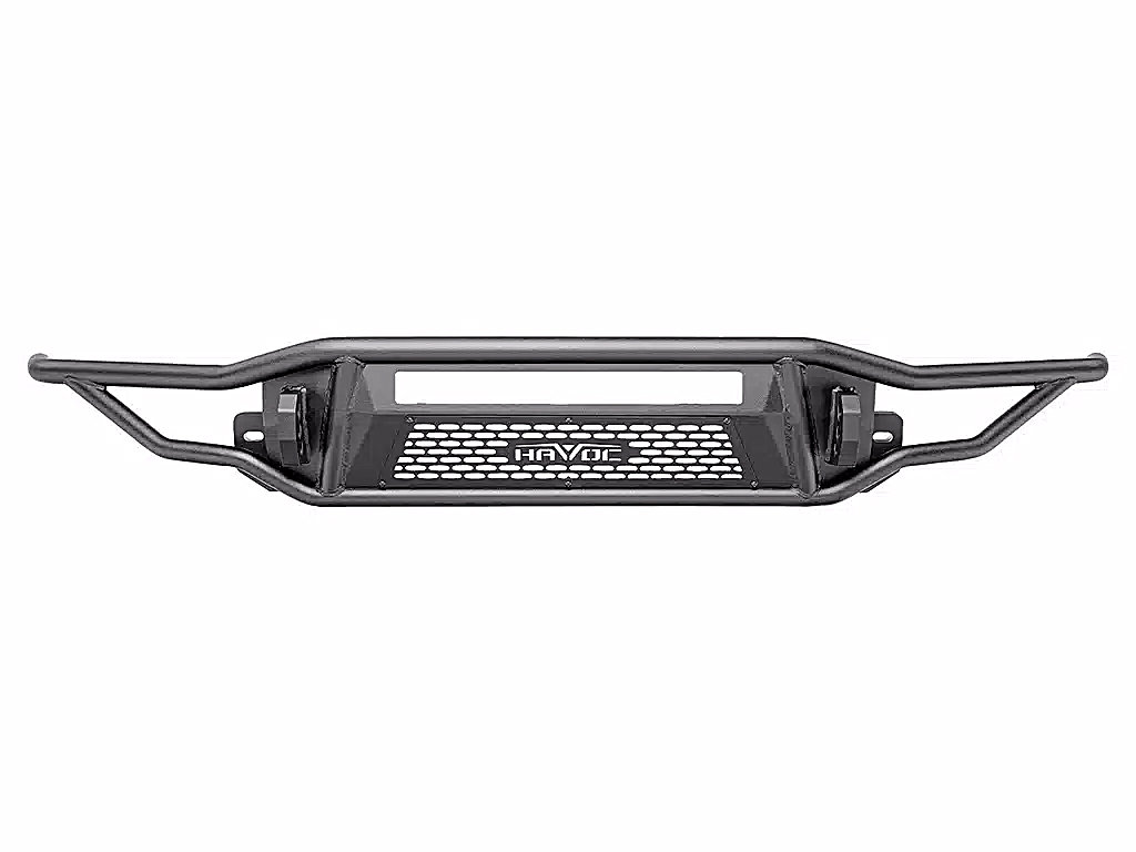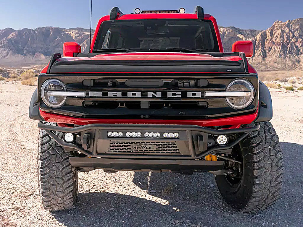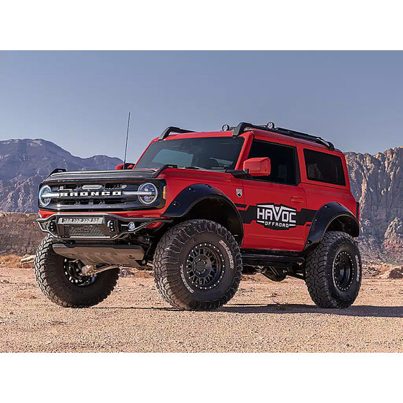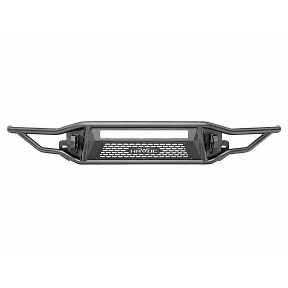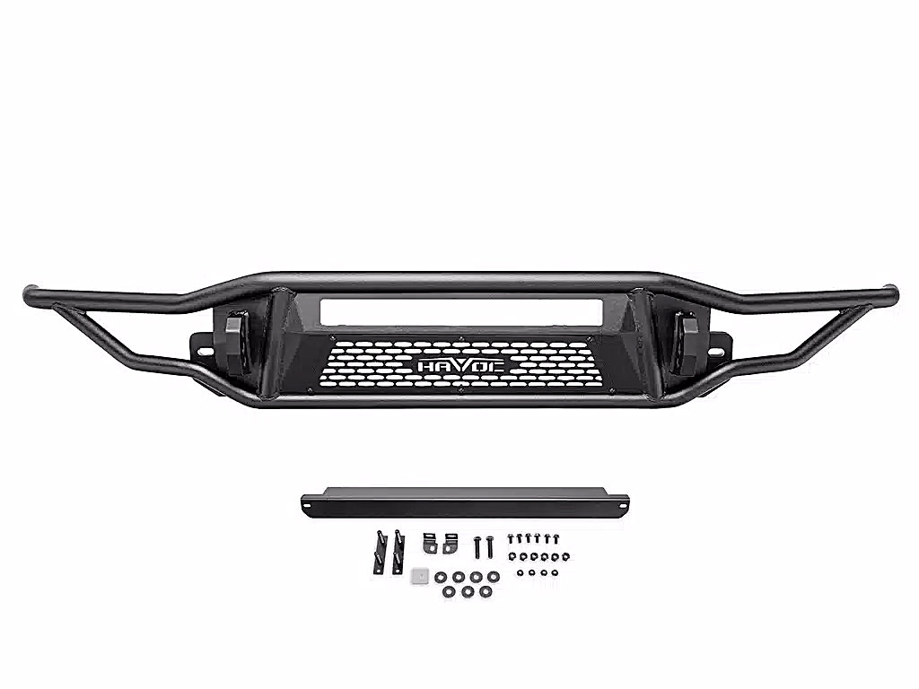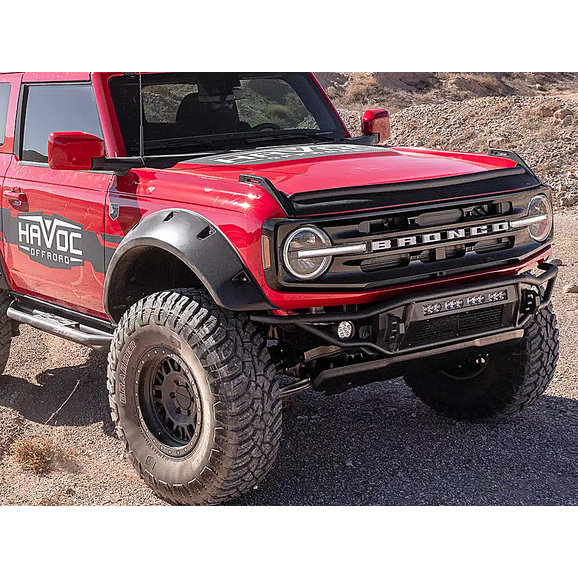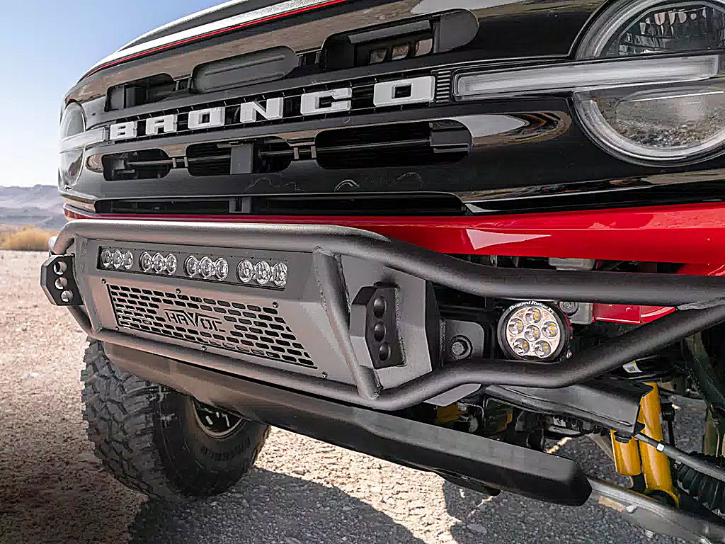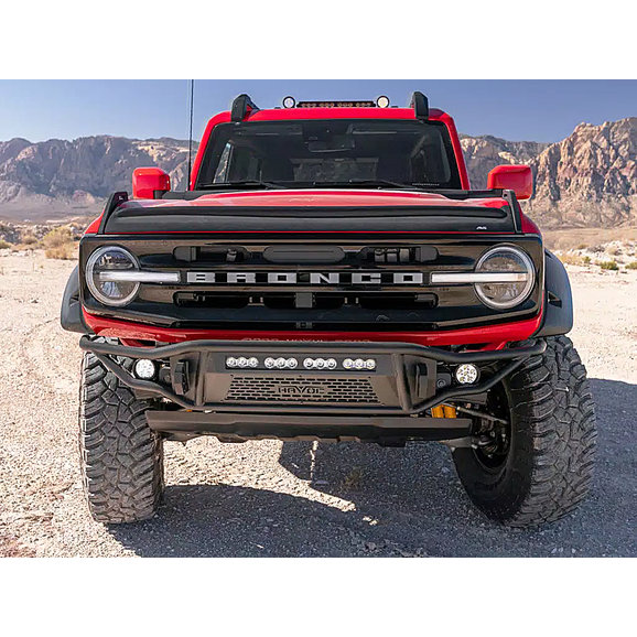 The Havoc Offroad Metal Masher Front Bumper is designed to bring your Ford Bronco up a notch. Manufactured from rugged steel tubing for long-lasting, durable performance with 1” dual-drilled recover hooks, this bumper is ready for the toughest of trails. The high-clearance design allows for larger tires and improved approach angles for better off-road performance. The bumper’s rugged look is complemented by a sleek textured black powder coat finish, which also offers improved resistance against corrosion. The recovery hooks are designed to work with a variety of D-shackles while the rest of the bumper accommodates most 20” LED light bars and dual outboard LED pod lights. All of these features combine to offer an incredibly capable and durable off-road bumper, and it comes backed by Havoc Offroad’s Limited Five-Year Warranty, so you can ride the roughest of trails with peace of mind.