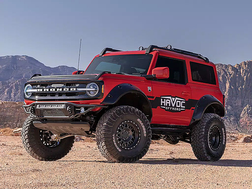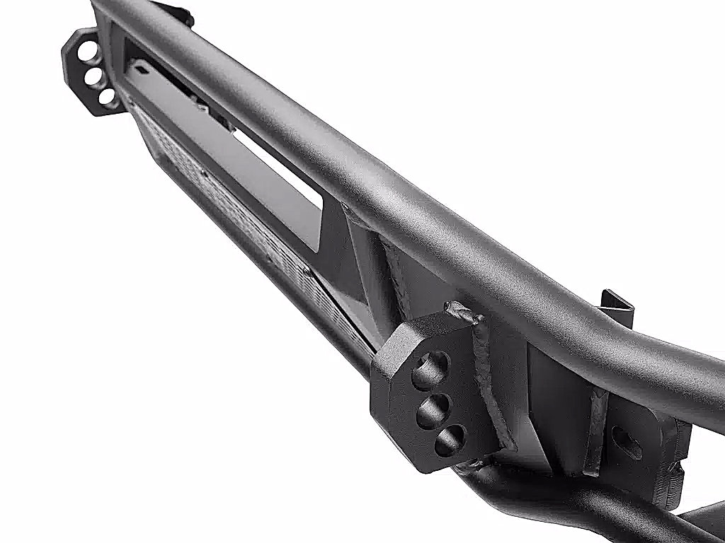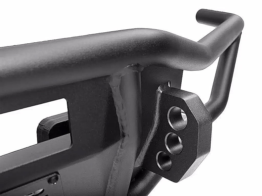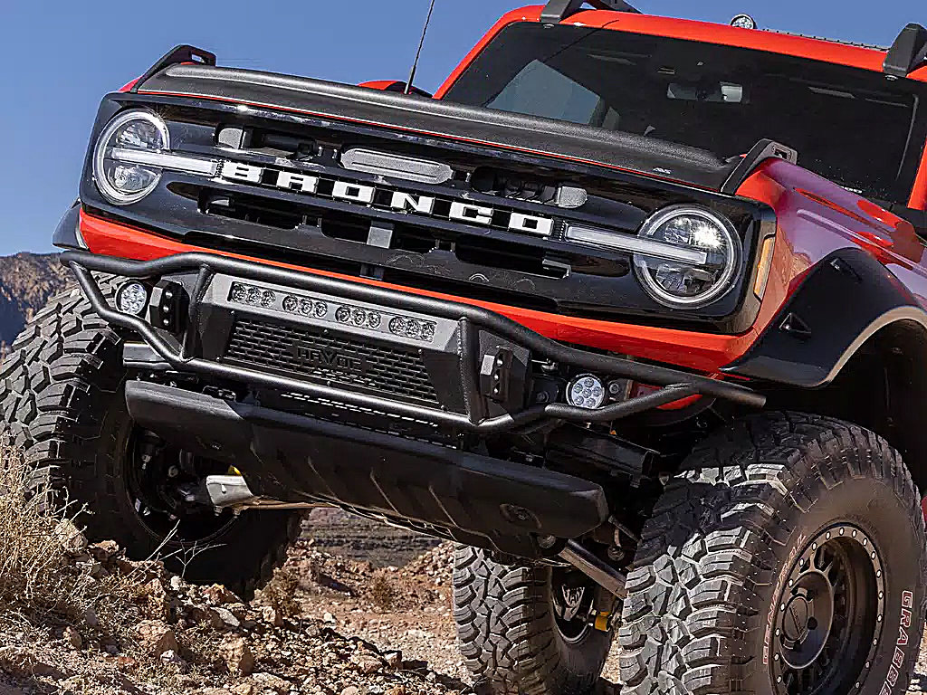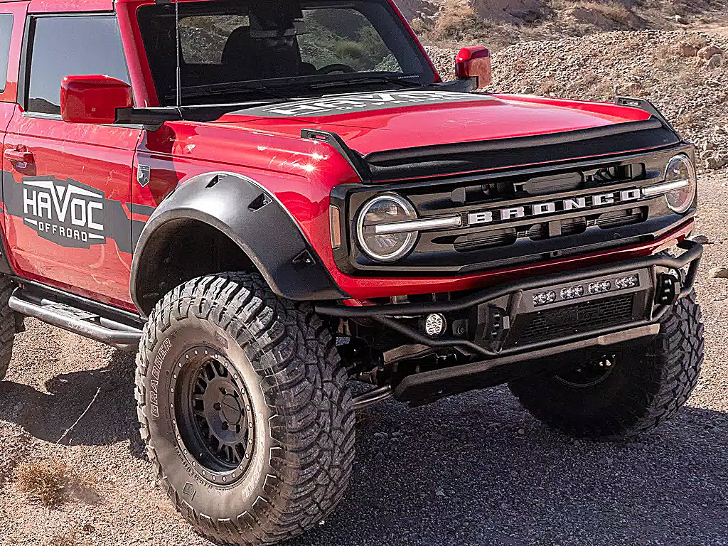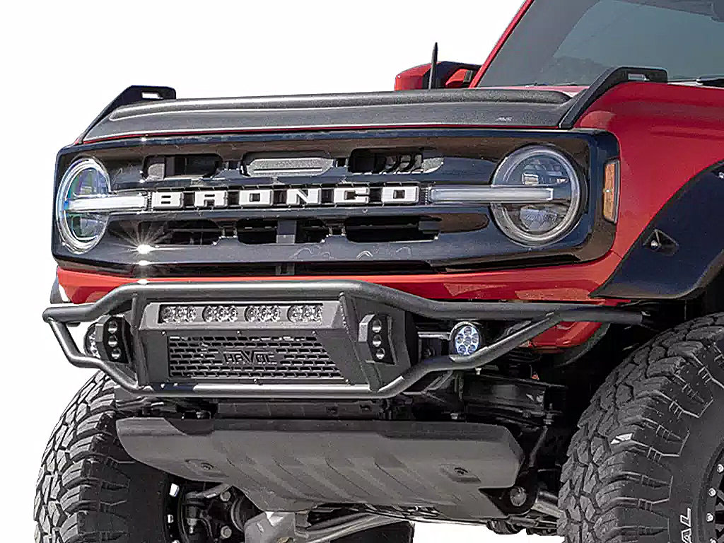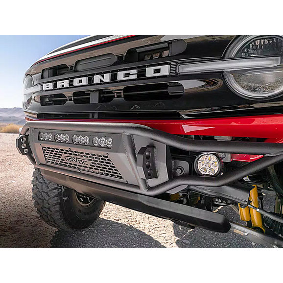 The Havoc Offroad Metal Masher Front Bumper is designed to bring your Ford Bronco up a notch. Manufactured from rugged steel tubing for long-lasting, durable performance with 1” dual-drilled recover hooks, this bumper is ready for the toughest of trails. The high-clearance design allows for larger tires and improved approach angles for better off-road performance. The bumper’s rugged look is complemented by a sleek textured black powder coat finish, which also offers improved resistance against corrosion. The recovery hooks are designed to work with a variety of D-shackles while the rest of the bumper accommodates most 20” LED light bars and dual outboard LED pod lights. All of these features combine to offer an incredibly capable and durable off-road bumper, and it comes backed by Havoc Offroad’s Limited Five-Year Warranty, so you can ride the roughest of trails with peace of mind.