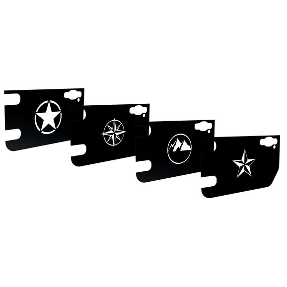 from high-quality steel. Style options include Military Star, Compass, Outdoor, and Texas Star. An aluminum version also offers different finishes of silver, black, or red, in gloss or textured powder-coated finishes. All installation hardware is included. Please Note: Drilling is required & bolt heads will be visible once installed. Professional installation is recommended.Details