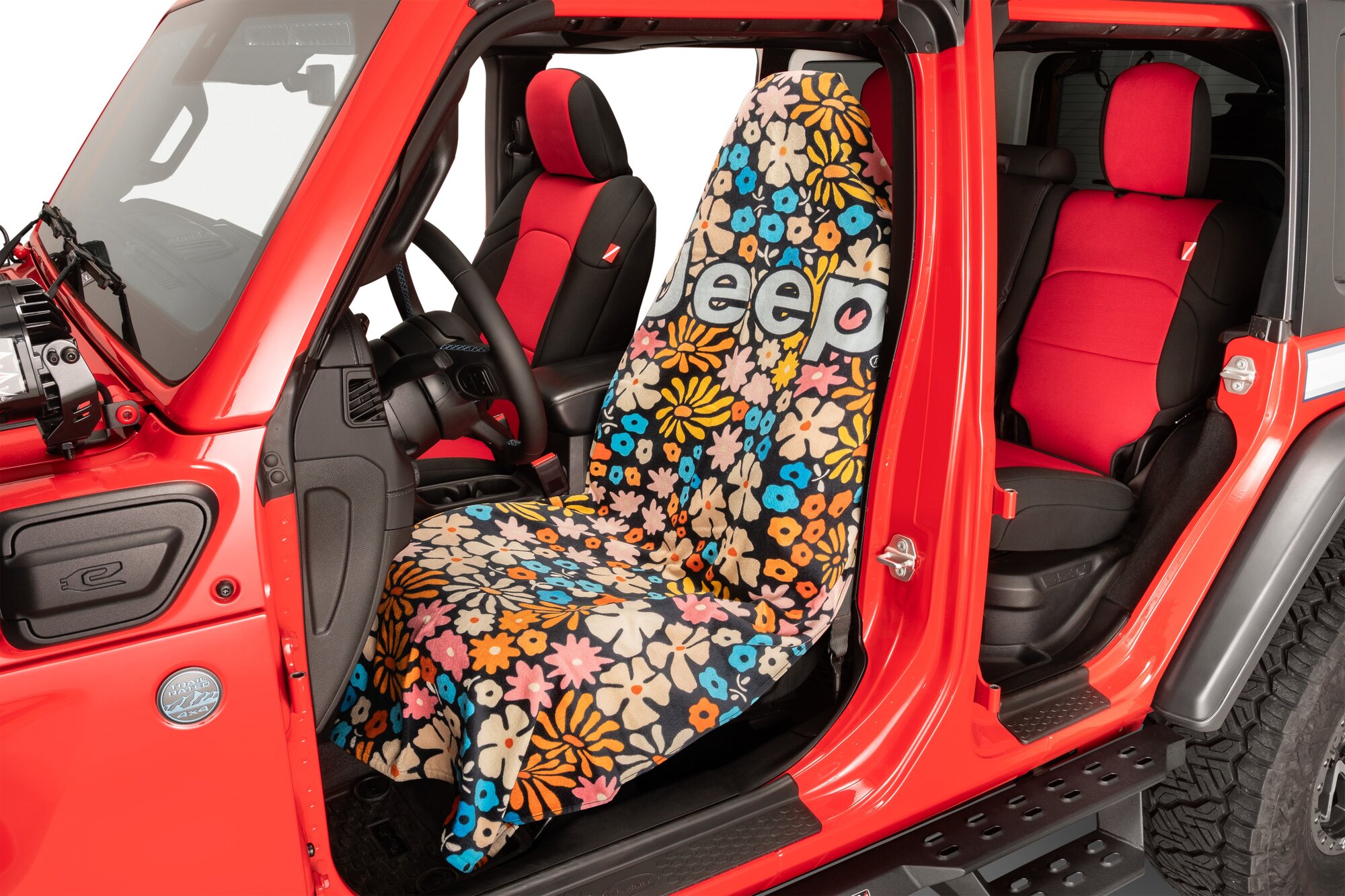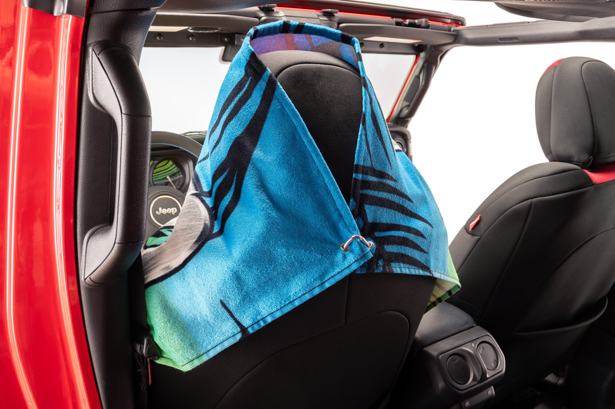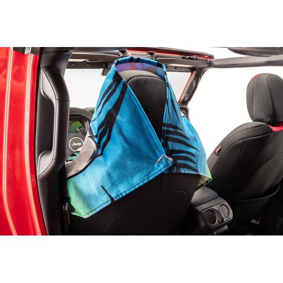Measuring a generous 34" x 64", the towel includes two reinforced grommets and a carabiner clip that secure it neatly over your headrest, preventing slipping or bunching as you drive. Whether you're hopping in with wet clothing, sandy gear, or just want quick seat protection on the go, this cover provides an easy, portable solution. With several color options available, it’s a great way to show your Jeep