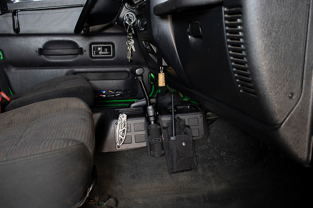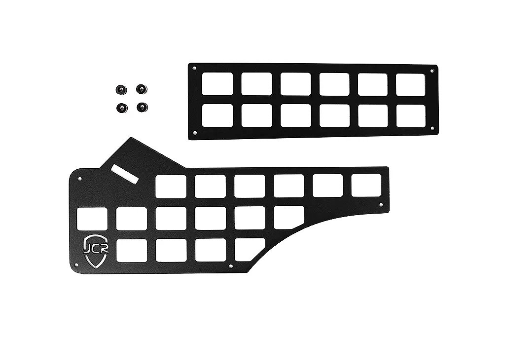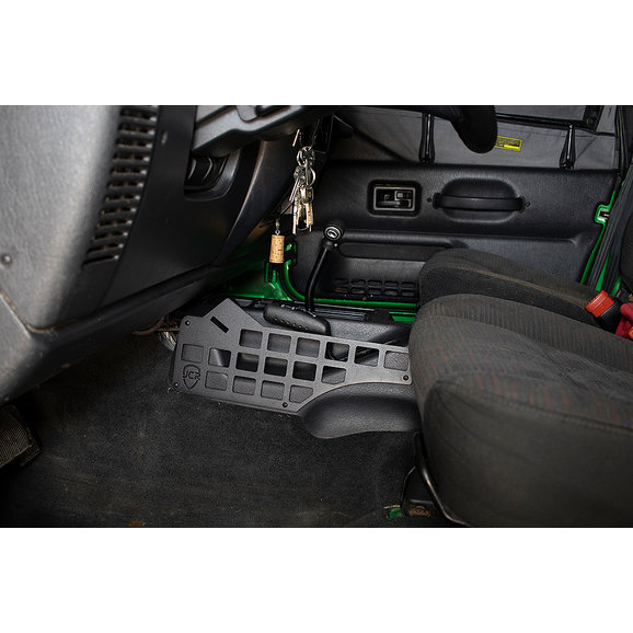 Have you ever been searching around for your flash light, pocket knife or other gear inside your Wrangler TJ? This can just lead to frustration so why not get a pair of Center Console MOLLE Panels to store your gear on so you kow where it is it every time while creating less clutter in your Jeep. These panels attaches on both sides of your center console giving you a place to attach small gear like flash lights or whatever else you can fit there keeping them within reach and secure. Made from CNC cut .120" steel for a precise fit then coated with a 2 stage textured black powder coat to prevent corrosion.