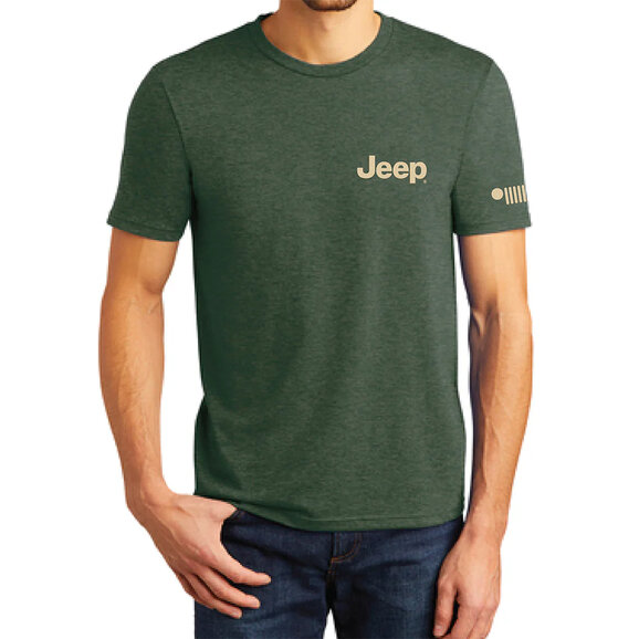 Gear up for your next journey with the Jeep Merchandise Men's Jeep For All Life's Adventures T-Shirt in a striking heather forest green. This stylish and versatile tee is perfect for Jeep enthusiasts who live for adventure.