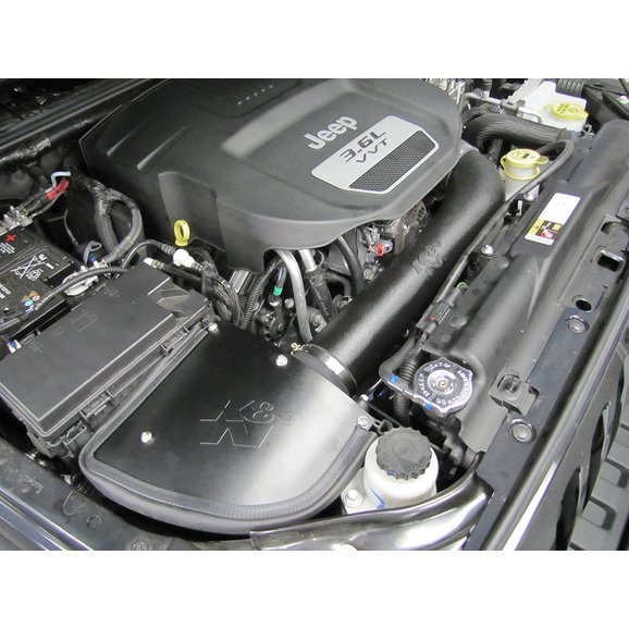 The K&N 57-1566 FIPK air intake system replaces the restrictive factory air filter and air intake housing in specific Jeep Wrangler models. K&N air intakes are designed to dramatically reduce intake restriction as they smooth and straighten air flow. This allows your engine to inhale a larger amount of air with less effort than the factory air filter assembly. More air means more usable power and acceleration throughout the engine's RPM range. This Cold Air Intake comes with a chrome topped K&N high-flow air filter and a K&N embossed heat shield that mounts into the lower air box to act as a cover allowing cooler, denser air to be directed through a custom molded intake tube into the engine's throttle body for a guaranteed power gain. The tube accommodates the air temperature sensor and crank case vent hose. The oversized cone shaped air filter can be used for up to 100,000 miles before servicing is needed depending on driving conditions. This air intake is relatively easy to install usually in 90 minutes or less using existing factory mounting points. The tools needed are a screwdriver, ratchet set and several wrenches.