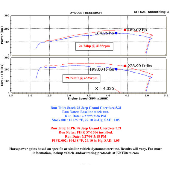 The K&N 57-1506-2 FIPK air intake system replaces the restrictive factory air filter and air intake housing in some Jeep Grand Cherokee models. K&N air intakes are designed to dramatically reduce intake restriction as they smooth and straighten air flow. This allows your Grand Cherokee’s engine to inhale a larger amount of air than the factory air filter assembly. More air means more usable power and acceleration throughout the engine’s RPM range. The 57-1506-2 air intake comes with a chrome topped K&N high-flow air filter and a heat shield that installs into the previous air box space. Air is directed through an aerodynamically engineered intake tube into the engine’s throttle body for a guaranteed power gain. The tube accommodates the factory crank case vent hose. The oversized cone shaped air filter can be used for up to 100,000 miles before servicing is needed depending on driving conditions. This air intake is relatively easy to install usually in 90 minutes or less using the existing factory mounting points. The tools needed are a screwdriver, a ratchet set and several wrenches. K&N 57 Series FIPK's are street legal in all 50 US states and come with K&N's Million Mile Limited Warranty.