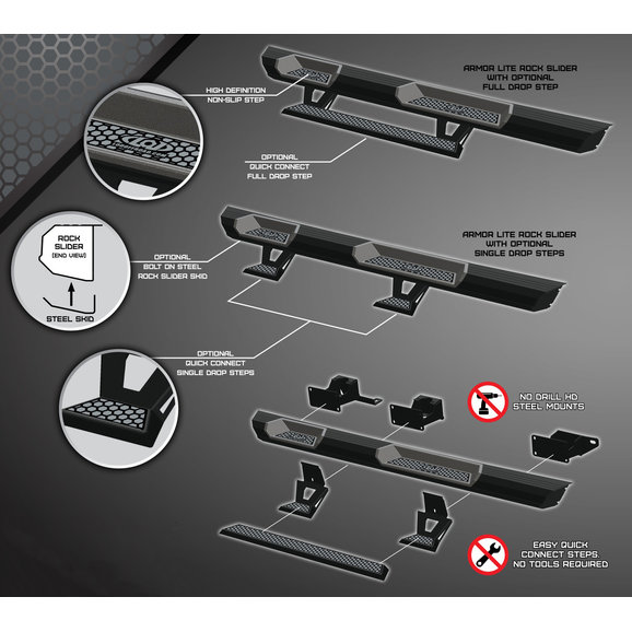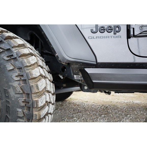 Design: These sliders are made for the true off-road adventurer by helping protect your rocker panels while on the trails as well as making sure you do not get hung up on rock when crawling over them. Also available to add on is a large footing area that has a traction pad to prevent slipping no matter how muddy your shoes are when getting in and out of your Gladiator JT. An optional high strength steel bolt-on skid plate allows you to protect the aluminum sliders from rock dings and scrapes as well.