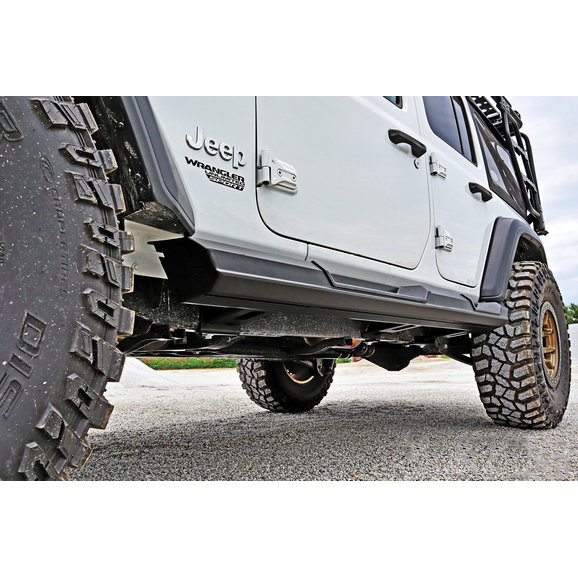 Design: These sliders are made for the true off-road adventurer by helping protect your rocker panels while on the trails as well as making sure you do not get hung up on rock when crawling over them. Also available to add on is a large footing area that has a traction pad to prevent slipping no matter how muddy your shoes are when getting in and out of your JL. An optional high strength steel bolt on skid plate allows you to protect the aluminum sliders from rock dings and scrapes as well.