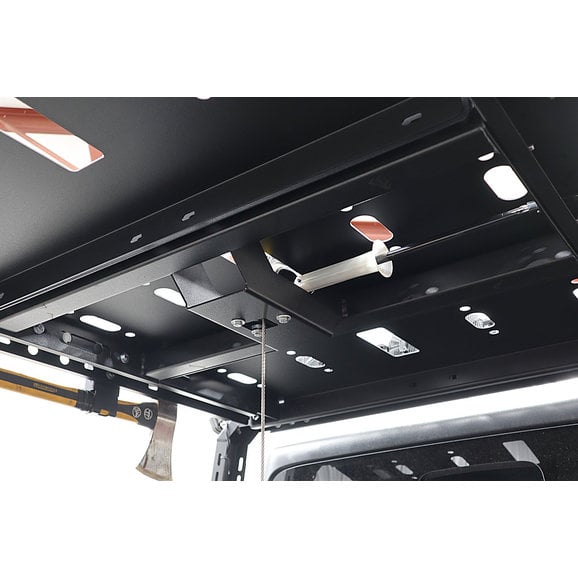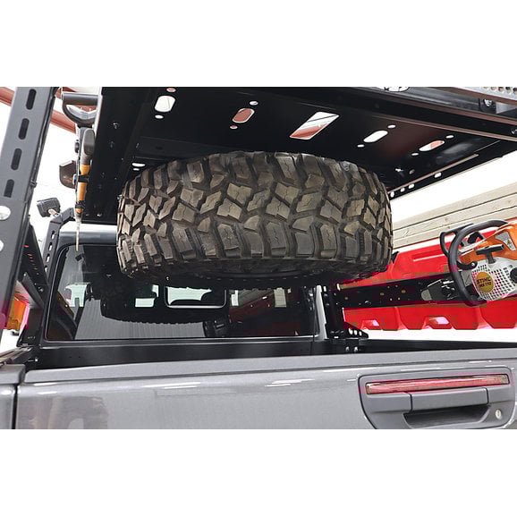 TheLoD Black Ops Bed Rack Tire Carrier Mount bolts directly to your Black Ops Bed Rack System so you can utilizes the Jeep Gladiator JT's stock spare tire winch system. This will give you the ability to carry your oversized spare tire with you without compromising the available space and storage of the bed of your truck.