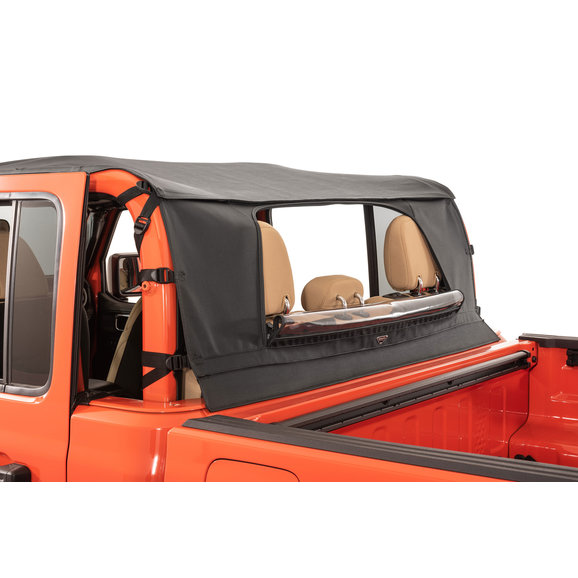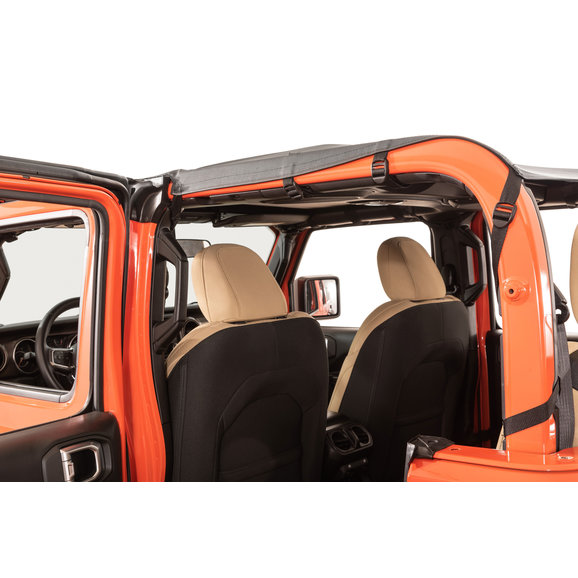 Block out the sun and get extra weather protection from sudden showers with a Bimini Plus/Wind Stopper Combo from MasterTop. This easy to install top and rear windscreen is constructed of durable 25 oz pinpoint Black Diamond Sailcloth fabric or MasterTop’ s exclusive 30 oz 3-layer luxury MasterTwill fabric with reinforced straps and a heavy-duty rubber seal to provide great weather protection. Each Bimini Plus attaches to your Gladiator JT without the use of any extra components. Attaching with durable vinyl straps with reinforced buckles and to factory mounting points on the roll bar, this top goes on and off like a breeze. The front portion of the top attaches between the Rollbar and windshield providing a tight, wrinkle-free fit. Only MasterTop incorporates a heavy-duty rubber seal under the front windshield on their Summer Bimini Tops to help prevent water and debris from entering the cab during heavy rain showers. The Wind Stopper wind screen attaches to the roll bar, the Bimini Plus, and to the rear of the cab rea on your Gladiator to help seal the cab area. The Wind Stopper has an exclusive zip-down window that allows air to flow on hot days. Though this top and Wind Stopper combo is not waterproof, it will protect you and your passengers from sudden showers while driving and of course from the sun’s harmful rays. 3-year limited warranty.