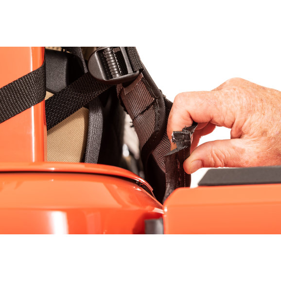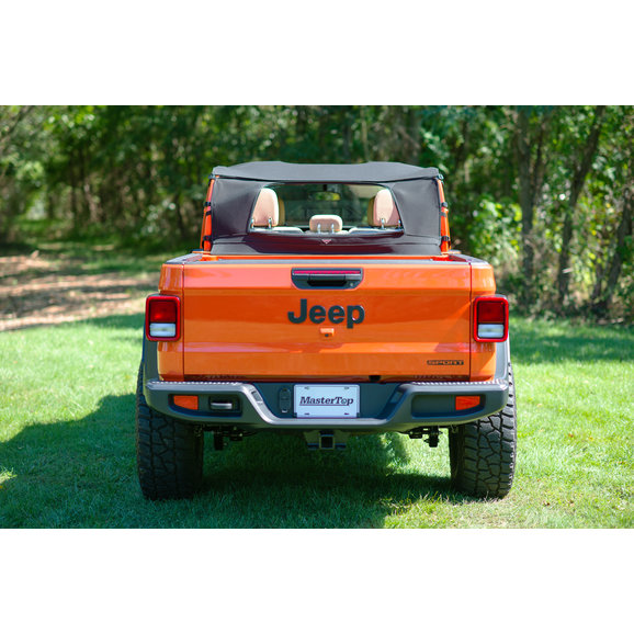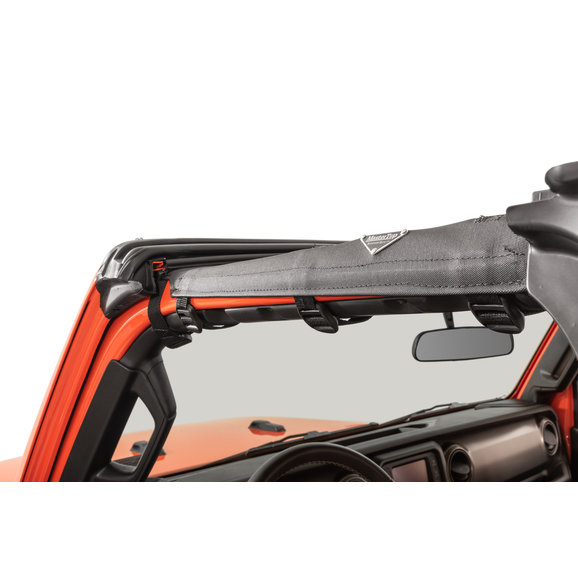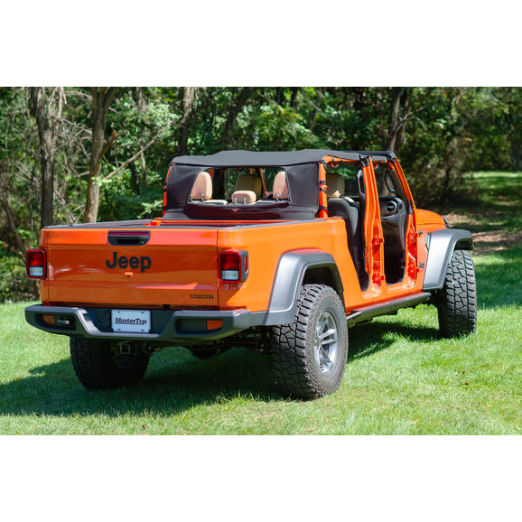 MasterTop innovation at its best! Introducing the new Integrated Grab Handle Summer Bimini Top Plus and Wind Stopper Combo for the Jeep® Gladiator JT. This new top and windscreen combo not only protects you from the summer sun, but it also has built-in grab handles making the entry and exit of your vehicle easy. This patent-pending new Bimini Top Plus design is constructed of durable luxurious 3- layer 30 oz MasterTwill or Durable 25 oz Sail Cloth Black Diamond fabric with either red or black webbed grab handles. Each Summer top is a “Bimini plus” design covering both driver and back seat passengers for the ultimate in protection. Since the grab handles are a part of the installation process and installed at the factory, the cost of this top system is less than if you purchased each part individually; Save money, add convenience! All Gladiator Bimini style tops use MasterTop’s exclusive no windshield header design with a front weather seal. The Wind Stopper portion of this combo attaches directly to the Bimini Plus Top and features a press polished clear rear window that zips open to allow air to flow while in the summer heat. This combo protects all passengers from sudden showers while driving. Note that the Bimini Plus/Wind Stopper Combo is not waterproof as rain can enter the cab over the doors and near the rear roll bar.
