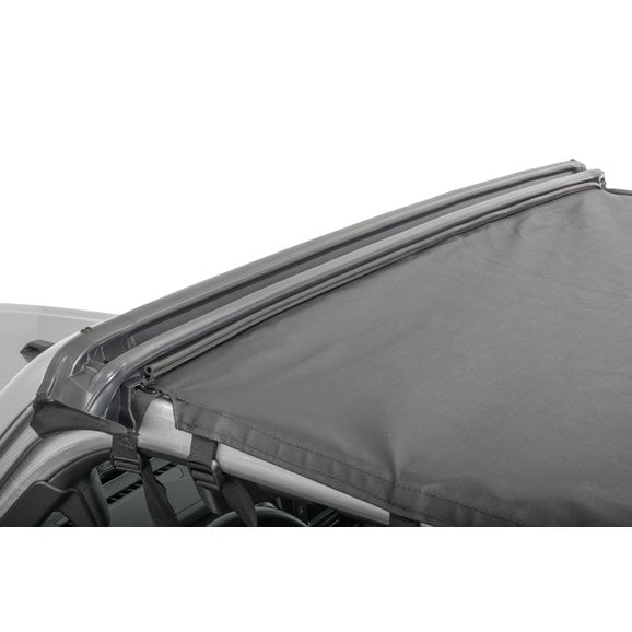 Block out the sun and get protection from sudden showers with a Bimini Top Plus Summer Top from MasterTop. This easy to install top is constructed of durable 25 oz pinpoint Black Diamond Sailcloth fabric or exclusive 3-layer 30 oz MasterTwill fabric with reinforced straps and a heavy-duty front header rubber seal to provide great weather protection. Each Bimini Plus attaches to your Wrangler JL 4-Door without the use of any extra components. Attaching with durable vinyl straps with reinforced buckles and to factory mounting points on the roll bar, this top goes on and off like a breeze. The front portion of the top attaches between the Rollbar and windshield providing a tight, wrinkle-free fit. Only MasterTop incorporates a heavy-duty rubber seal under the front windshield on their JL Bimini Tops to help prevent water and debris from entering the cab during heavy rain showers. Though this top is not waterproof, it will protect you and your passengers from sudden showers while driving and of course from the sun’s harmful rays. Combine this top with a MasterTop Wind Stopper and Tonneau summer combo and you have a great summer top! 3-year limited warranty.