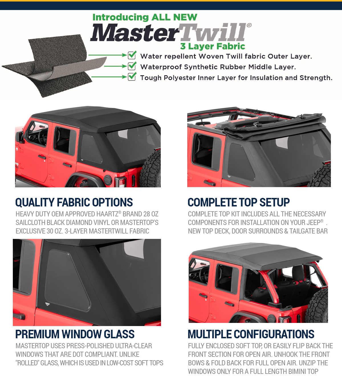 This Matertop soft top is soooo much better than the Bestop. It doesn't require a bunch of clunky hardware in the back nor does it look like a a bulky sleeping bag sitting on the back of my Jeep like the Bestop ---> and it is half the price. The quality is great and for an extra $100 it is worth the upgrade to the MasterTwill. For the review that says days to install I have a question. "Do you know what an allen wrench is? :-). I am somewhat handy and it took me about 2 hours to install with help from a friend. You definitely need an extra set of hands for some of it and to help line things up.