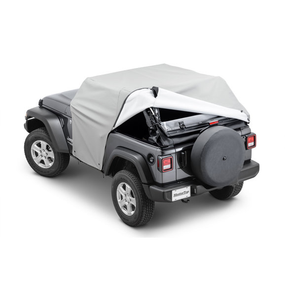Mastertop's Full Door Cab Cover offers quick and easy protection from the elements at your fingertips. These durable covers fit over your vehicle’s windshield and sports bars when your factory soft top and Soft Top hardware is folded down on top of your rear roll bar, providing protection from the sun, and those sudden showers. Each cover is constructed of durable non-woven vinyl-covered fabric for the ultimate in durability and vehicle protection from water, dust, dirt, and those harmful UV rays. The fabric itself is waterproof and the seams are located away from pooling water making this cab cover the ultimate weatherproof design. Each cab cover has a long panel on each side of the cover that protects the door opening from water and debris when the doors are removed and the cover is installed. The light gray color reflects the sun and keeps the interior of your Jeep cool. This is a great cover for parking your Jeep during the day while at the office or at school or in the garage during those long winter months.