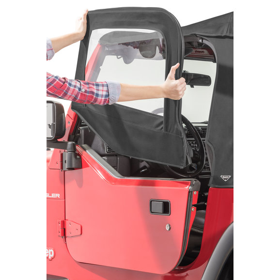 Perfectly match your MasterTwill Replacement Top or Summer Combo in MasterTwill for 97-06 Jeep Wrangler TJ equipped with half steel doors, with our Replacement Upper Door Pair in MasterTwill by MasterTop. Available as replacement fabric skin and Window to use with your existing upper door frames, or included with new Frames, the fully DOT approved 40 mil clear, pressed polished windows zip open with high quality zippers and have the same 3 layer highly engineered MasterTwill fabric that gives that high end sports car convertible top look and keeps moisture out with a water repellent woven fabric outer layer, waterproof synthetic rubber middle layer, and a tough Polyester inner layer providing great insulation and strength. Each option you choose, with or without the frames are sold in pairs and carry a 3 Year Warranty.