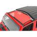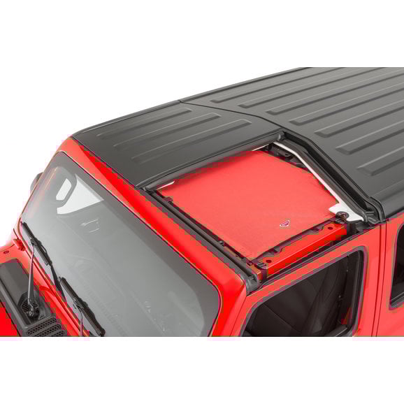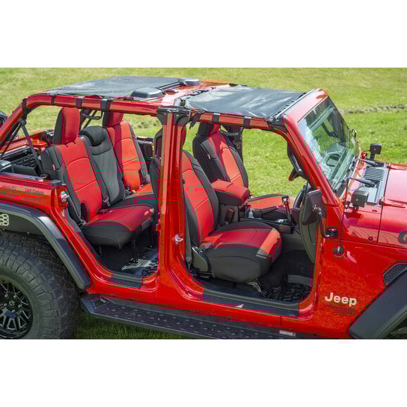 ShadeMaker Freedom Mesh Bimini Tops are a great way to feel the freedom of driving your Jeep without a top, but without burning in the sun. These summer tops are an excellent way to get additional driving enjoyment from your Wrangler JL Unlimited with the ease of keeping the mesh top on when you put the hardtop back on. The easy on and off MasterTop ShadeMaker Freedom Mesh Bimini Top Plus provides generous coverage over the front and rear seats. Unlike most tops, the Freedom Mesh tops are designed to work with hardtop model Wranglers. No header channel is required for install. ShadeMaker Mesh tops are constructed of extra durable mesh fabric originally developed for commercial trucking to keep cargo in place. The mesh weave blocks up to 70% of the sun’s harmful UV rays and features heavy-duty webbing at the edges providing super strong attachment points that are not seen on the competitors. The stylish two-piece design allows you to run with both front and rear portions attached or just the front Bimini over the driver and passenger. The “flap free” design attaches easily with durable web straps and buckles. The rear mesh portion attaches to factory mounting points providing the most secure install of any mesh design-no drilling required! Available in Black or Red mesh colors, and covered by MasterTop’s 3-year warranty. Image