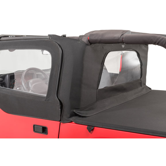 Finally The Ultimate Summer Soft Top Combination!, designed specifically for 04-06 Jeep Wrangler Unlimited. These 4 piece kits designed to be used with your factory style door surrounds, and tailgate bar, include a Bimini Top Plus, No Drill Windshield Header, Wind Stopper Plus cab curtain and a custom fit Tonneau that when all used together helps to close up the cab and rear of your Jeep Wrangler Unlimited. If you are replacing your hard top, we offer a complete kit that includes the necessary door surrounds and Tailgate bar plus all other necessary components for a complete install. All Three soft components of the Summer Combo are constructed of durable three layer woven MasterTwill fabric, making this combo the ultimate in luxury, usually found on European sports car's convertible tops. The Bimini Plus has a unique design that attaches to your factory door surrounds providing a tight, flap free fit. The Wind Stopper Plus features a unique, easy to install wrap around design that seals around the door surrounds. Wind Stopper plus has an exclusive zip down rear window to allow air to flow through the cab on those hot days. The Tonneau is custom designed to fit your Jeep Wrangler Unlimited and attaches to the Wind Stopper Plus with a heavy duty zipper and hook & loop fastening system. For Jeeps that have Half Steel Doors, The Ultimate Summer Combo kit is available with or without Perfectly Matched MasterTwill Door Skins that fit over your factory door frames (Door frames not included in the kit). These complete packages require the use of factory style door surrounds and Tailgate bar/clips for installation. All combo kits are designed to be used with the Soft top hardware completely removed (Except the door surrounds and tailgate bar). Detailed four color instruction sheets make this summer soft top combo easy to install and MasterTwill fabric provides superior quality. 3 year limited warranty.