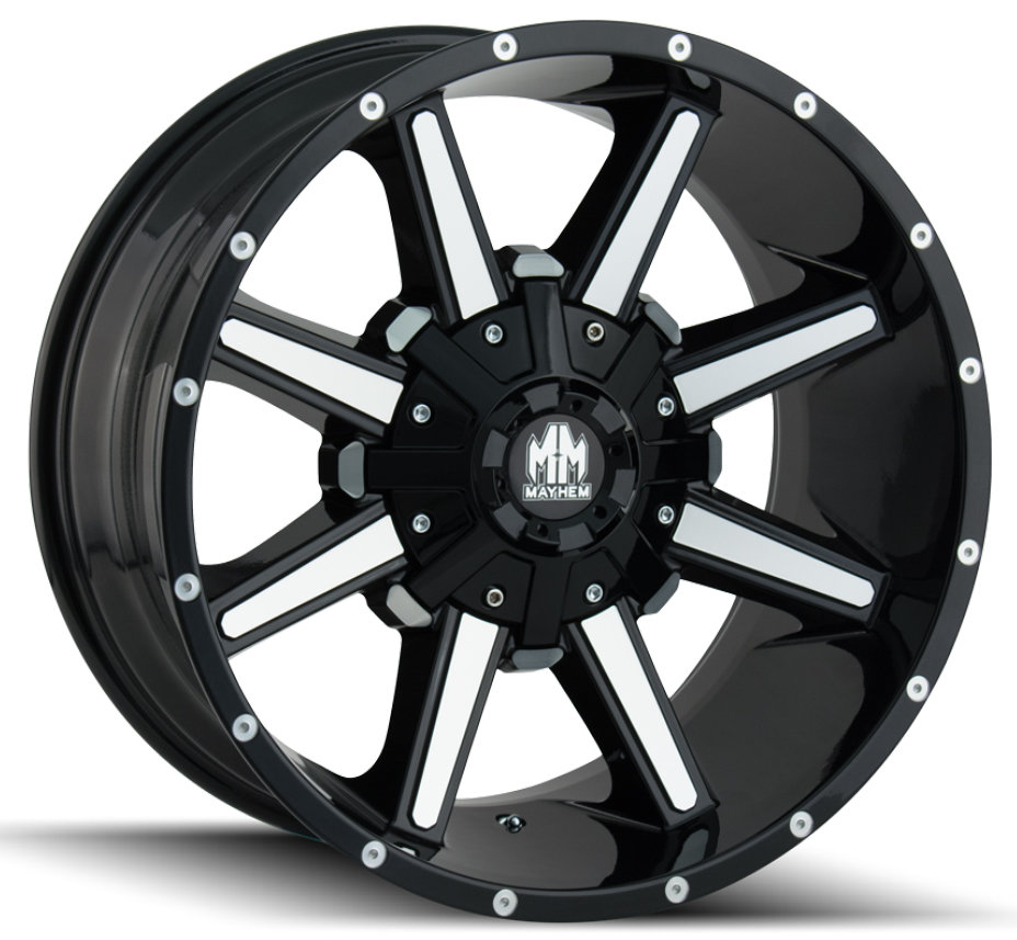 Improve the look of your Jeep with the Mayhem Arsenal Series 8104 Wheel. These heavy-duty wheels feature a large center hub with an 8-spoke design. Not only do they look great on the street, but they are also tough enough to perform off-road. Mayhem offers their Series 8104 wheels in two finish options. Choose from either Gloss Black with Machined Face or Chrome.