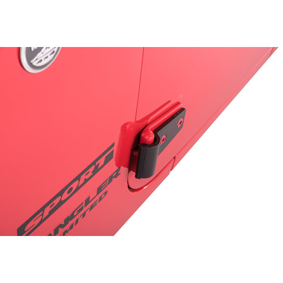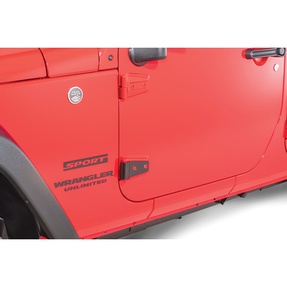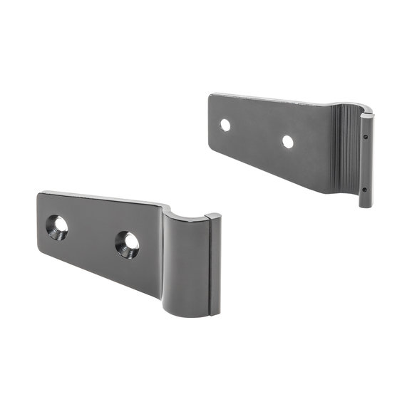 Eliminate the chance of a door fully swinging and smacking the mirror arm on the upper fender area when the door check strap was unfortunately unattached. This commonly occurs to people who often remove the doors and usually results in a large golf ball sized dent to the body costing hundreds to fix. The Mirage Door Stop brackets are sold in pairs and will protect front or rear doors from potential damage. The brackets attach to the lower door hinges using the factory bolts and install in minutes. Brackets have an integrated rubberized edge that contacts the hinge plate to stop the doorfrom swinging further. The Mirage Door Stops brackets do not contact the body and reduce stress on the factory nylon strap. It’s ingenious! Features a black powder coat finish that can be painted to match the vehicle or install as-is. This product is not meant to be used as a replacement of the door strap. Made in USA.
