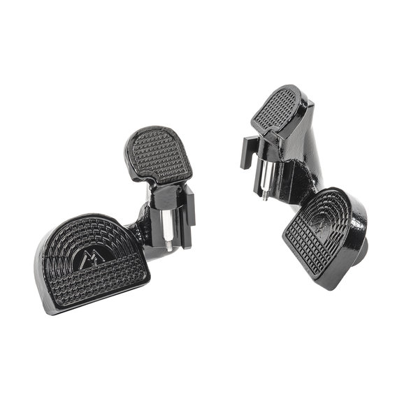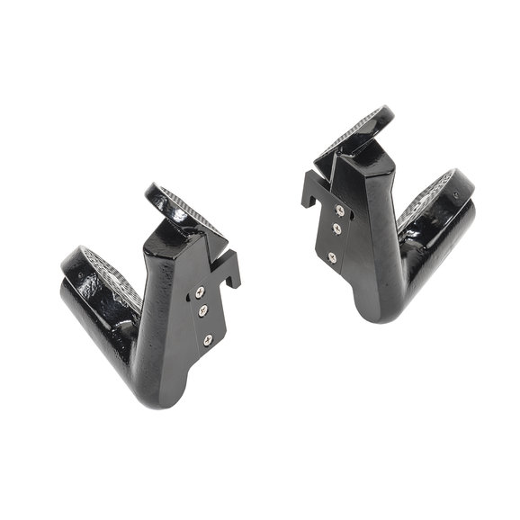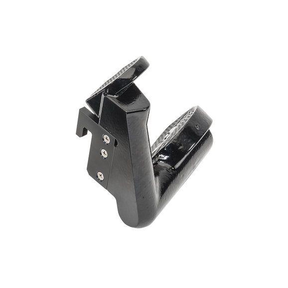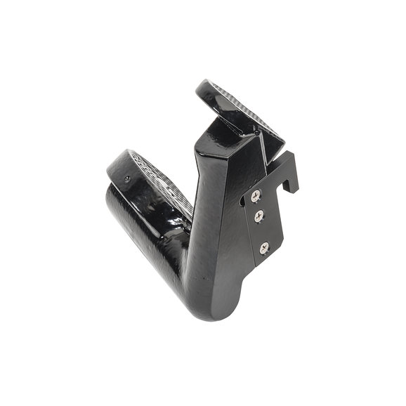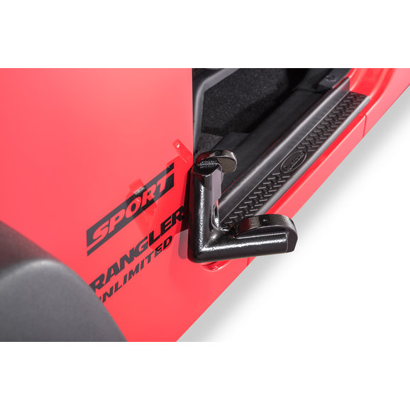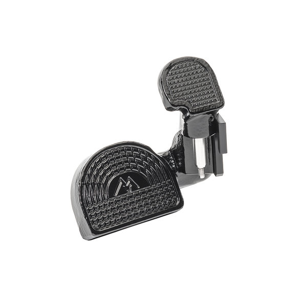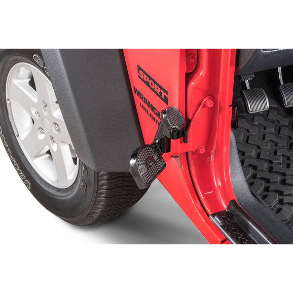 Enjoy a little more driving comfort with the doors off and having a comfy place to rest your foot. The Mirage Foot Rest boasts solid aluminum machined castings with two footrest areas to reduce fatigue. This footrest drops effortlessly onto the lower front door hinge with a machined fit and does not contact the body sheet metal. The Mirage Footrest features a stainless steel hinge pin with threaded ends to secure the footrest and discourage theft. The Mirage Footrest is a work of art and comes with a durable satin black powder coat finish for lasting durability. Use your existing factory hinge nut to secure the footrest. Nut not included. Made in the USA!