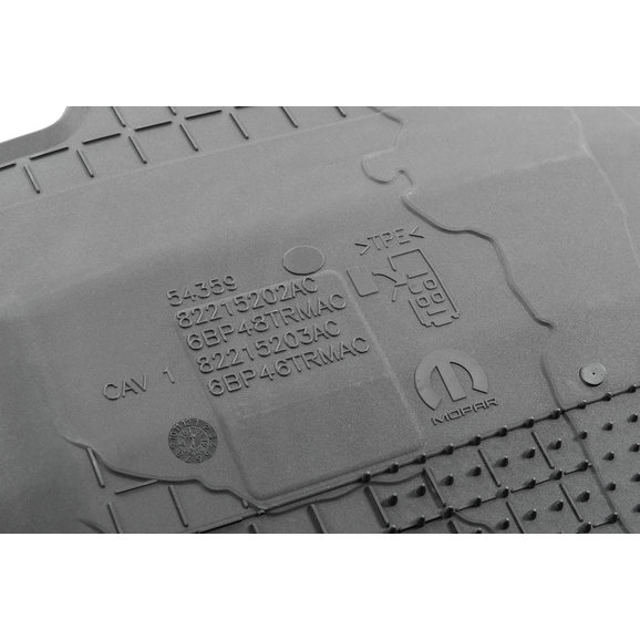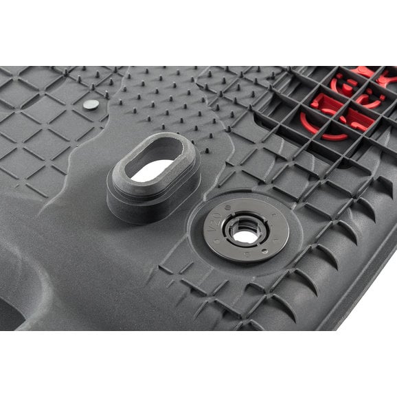 Protect the floor of your new 2-Door JL with the Mopar All Weather floor liner pair. This 2-piece set will fit into the driver and passenger side front foot wells and will protect the floor from any wetness front snow, mud, sand, rain or anything else that could possibly be trekked in from the outside elements. The floor liners are a high wall, bucket-style construction that provides maximum coverage and protection. The front set features a terrain style pattern with the red Jeep brand logo. They fit perfectly over the front drain holes to allow for draining without having to remove the mat. The mats will stay in place with the durable nibbed backing and grommets that attach to the factory retention posts. Sold in pairs.