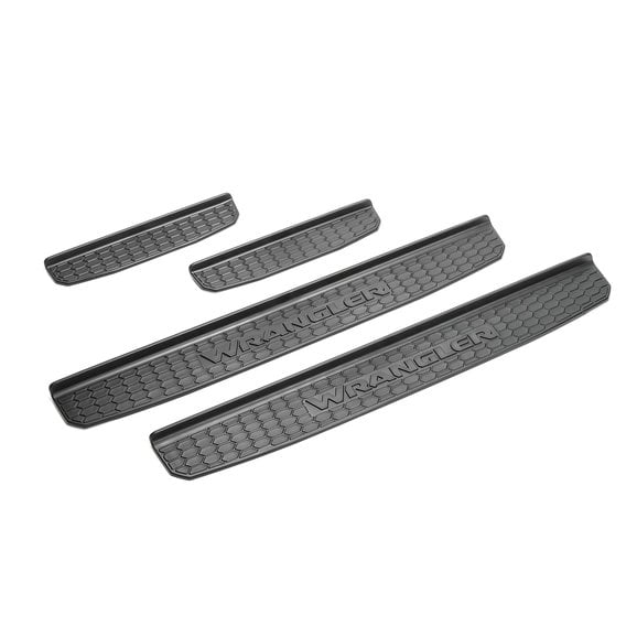 Protect your door sill when you get in and out of your Wrangler JL with these Mopar Door Sill Guards for 2018-24 Jeep Wrangler JL Unlimited models. Made of durable plastic featuring a molded three-dimensional honeycomb background along with a Wrangler logo, these guards are an easy add-on to your Wrangler JL. These guards help protect yourt vehicle from scratches, scuffs and fluids while maintaining your door and door seal functions. Kit includes a pair of front and rear guards.