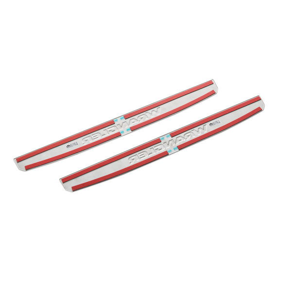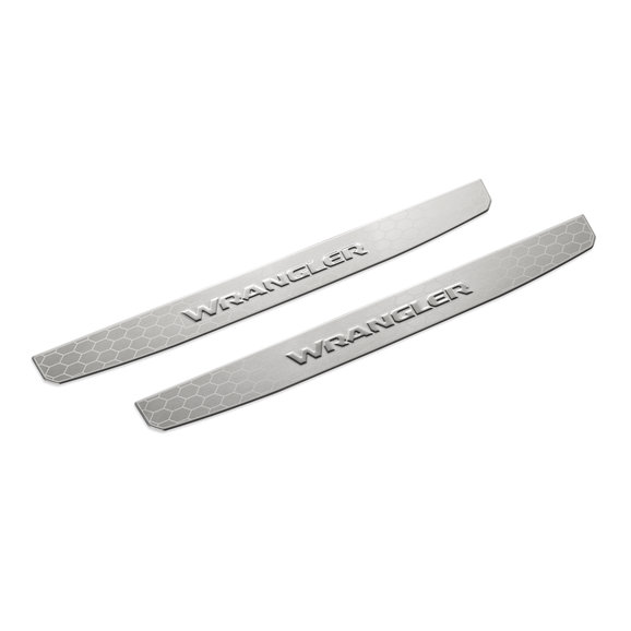 Wrangler JL owners can add a bit of stylish protection with this set of Stainless Steel Door Sill Guards from Mopar. Constructed of durable stainless steel, these genuine OEM quality guards feature a stylish acid-etched honeycomb background with a polished Wrangler logo. This pair of door sill guards are designed to protect from scratches, scuffs, soiling and overall wear and tear that happens over time. Door functions and seals are not affected at all by these guards, and install is simple with the included heavy duty automotive adhesive that will keep them in place. Sold in pairs.