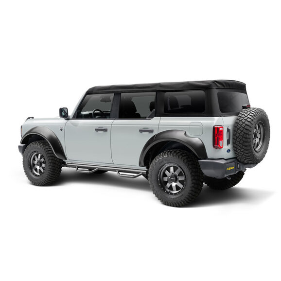 N-FAB's Podium LG Side Steps are specially designed to fit Ford Bronco Four-Door models, while offering a hoop step design and all-new expanded, enclosed sure grip step plate for ultimate vehicle access in all conditions. Steps engineered with solid steel and include a three-inch main tube diameter that allows high & tight fitment to vehicle's body. Includes detachable brackets for simple installation to factory mounts. Steps sold in pairs and are available with a textured black powder coat for long-lasting durability. Features a five-year finish warranty on the textured black finish and a lifetime craftsmanship warranty.