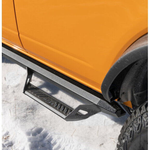 N-FAB's Predator Pro Nerf Step System allows easy access to Ford Bronco 2-Door models. Created with 100 percent aluminum for superior durability and corrosion resistance, while large dimpled step provides excellent traction in all weather conditions. Fully welded one-piece design mounts tight to body for clean look and works with both stock and lifted vehicles. Includes all hardware for simple installation to factory mounting locations. Steps sold in pairs and features five-year finish warranty and lifetime workmanship warranty.