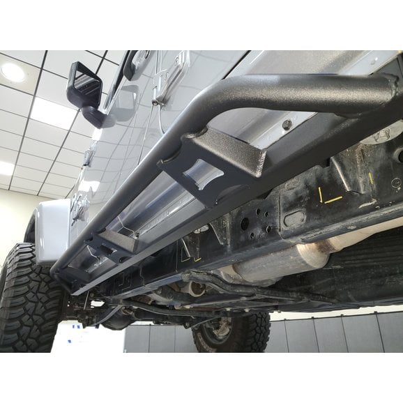 Construction: Made from 2” x 2” .1875”-wall primary tube with .188”-thick steel plate gussets, .095”-wall outside tube with steel gussets will protect your jeep from side impacts. Solid milled mounting ends provide strength and durability to hold up to whatever you may come across on your off-road adventure.