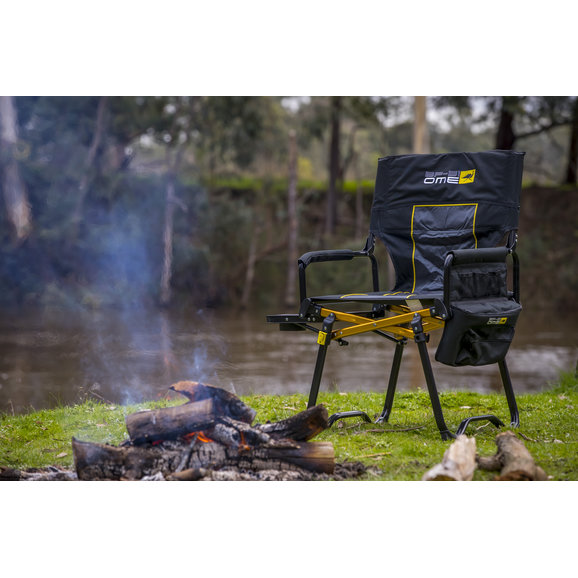 Convenient Design: For ease of use, The Old Man Emu BP-51 Compact Director Chair has an easy folding action with lock-out button. The right side of the chair has a table with cup holder, the left has a cooler bag with mesh pockets, and the back of the chair has a built-in magazine pocket.