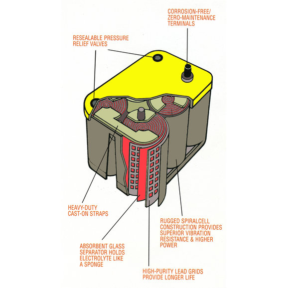 This ultimate battery is Ultra-Heavy Duty with Spiralcell technology that provides 750 Cold Cranking Amps (at 0 degrees F) for easy starting on extremely cold days. Spiralcell construction is 15 times more resistant to shock and vibration than normal batteries, so it is designed for all your overland adventures and offroad abuse on the trail. These completely sealed batteries never need water or maintenance of any kind and can be fully recharged in about three hours.