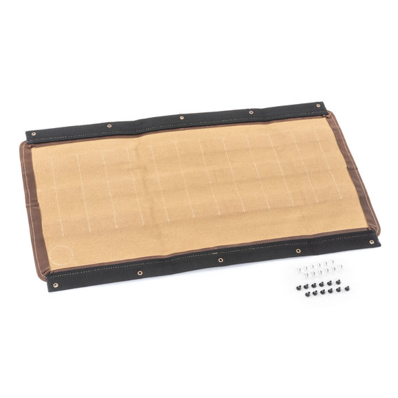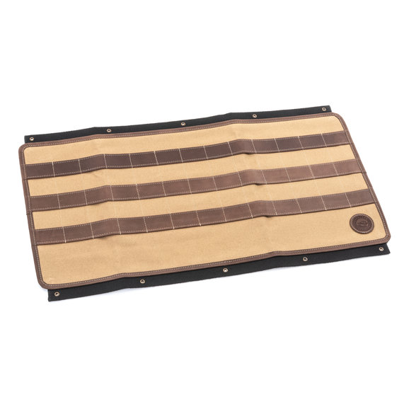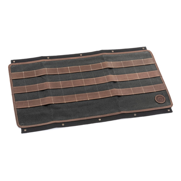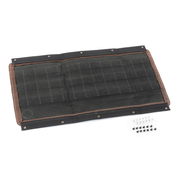 Functional storage is the goal with the HD MOLLE Tailgate Panel from Overland Outfitters. The panel attaches to the inside of the Wrangler JL tailgate and provides a secure location to add Grab & Go bags, First Aid bags, or any other style of MOLLE bags you may already own. Made from durable military-grade canvas, this panel features real leather and brass accents to up the level of style to your interior. The MOLLE panel matches up and easily installs to the tailgate with minor drilling required for the installation. The HD Molle panel measures approximately 12" high and 26.5" wide and is available in your choice of Black or Tan. Grab & Go MOLLE bags are sold separately.