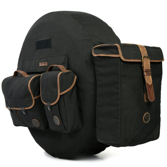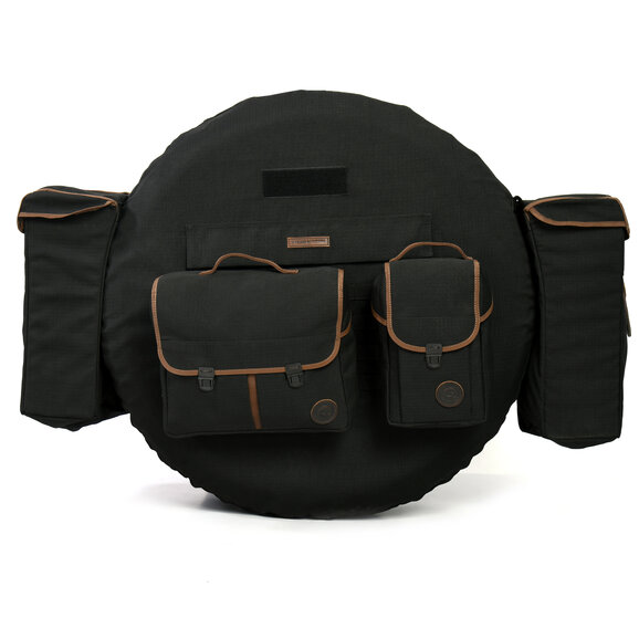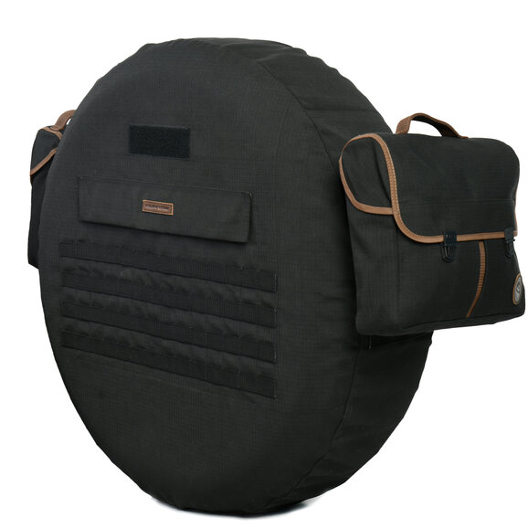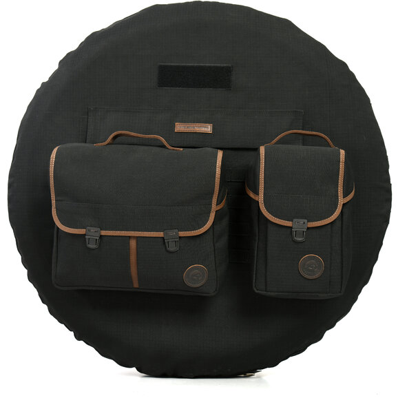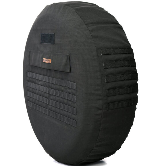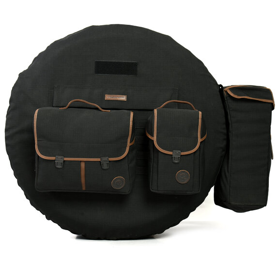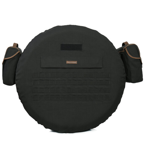 Pouches are not includedThe struggle is real when deciding what to take with you the next time you load up your Jeep for an over-landing adventure with space at a premium. This is whereOverland Outfitter's Tactical Spare Tire Cover comes into play in a big way. This tire cover offers several velcro spaces for you to attach MOLLE bags full of gear as well as an zippered storage pouch that can easily fit your tow strap or other smaller gear you might need on the off-road.