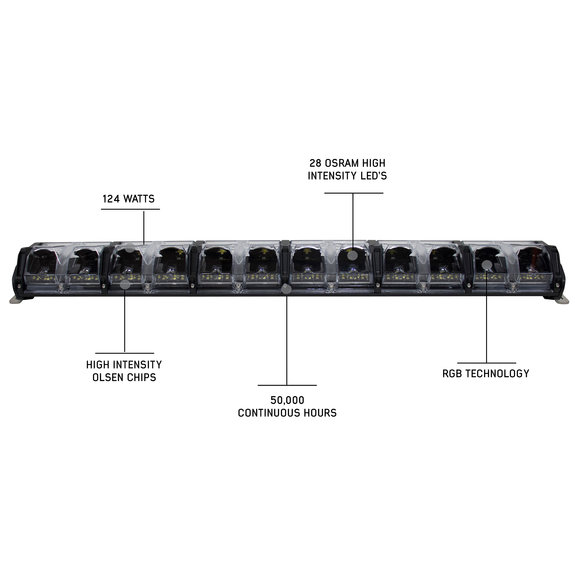 The EKO 30” LED Light Bar from Overland Vehicle Systems is one of the most versatile and high-quality light bars you can get. This 10” LED light bar is tough! With an IP68 rating, this unit is waterproof and dust-proof which ensures years of optimal performance under any type of climate or driving conditions. The body of the light bar is specially designed using aircraft grade 6061 aluminum with heat dissipating fins, which will help keep the light cool. The high intensity Osram LED’s produce 372 watts while pumping out up to 30,800 Lumens. The internal Olson chip and RGB technology has a lifespan of over 50,000 hours of continuous of usage. This light can do it all for you. The LED light bar can function as a DRL, high to low beam, spot beam and the RGB running light has 8 color options. All of the necessary wiring is included (with relay and fuse) and mounting brackets with stainless hardware complete the package for a no hassle install to the location of your choosing on the Jeep.