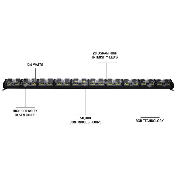The EKO 50” LED Light Bar from Overland Vehicle Systems is one of the most versatile and high-quality light bars you can get. This 10” LED light bar is tough! With an IP68 rating, this unit is waterproof and dust-proof which ensures years of optimal performance under any type of climate or driving conditions. The body of the light bar is specially designed using aircraft grade 6061 aluminum with heat dissipating fins, which will help keep the light cool. The high intensity Osram LED’s produce 620 watts while pumping out up to 52,500 Lumens. The internal Olson chip and RGB technology has a lifespan of over 50,000 hours of continuous of usage. This light can do it all for you. The LED light bar can function as a DRL, high to low beam, spot beam and the RGB running light has 8 color options. All of the necessary wiring is included (with relay and fuse) and mounting brackets with stainless hardware complete the package for a no hassle install to the location of your choosing on the Jeep.