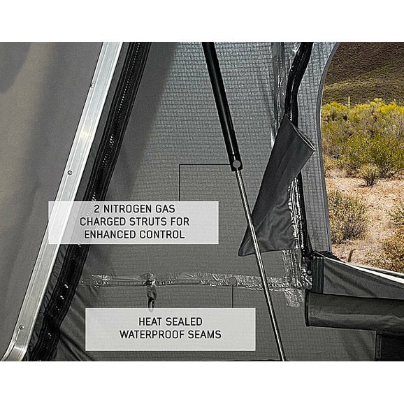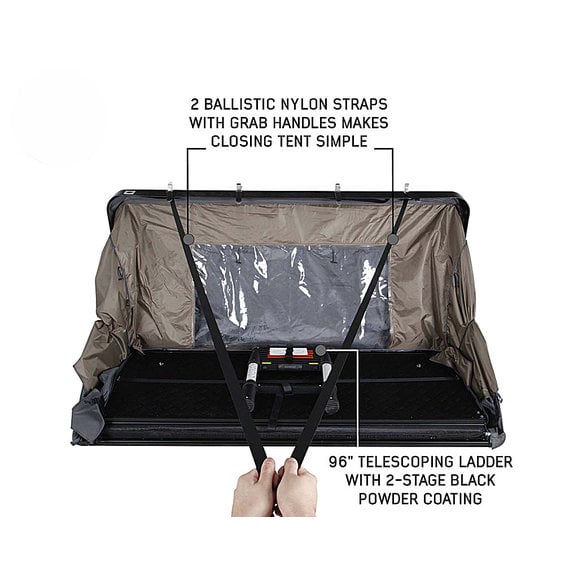Overland Vehicle Systems' Bushveld II Hard Shell Roof Top Tent gives you the performance and durability you require, space you need and element-protection you require — all with a footprint that neatly locks down for aerodynamic excellence while driving. This 4-season cantilever-designed Roof Top Tent has one of the largest sleeping areas on the market, military-grade seal system and a one-piece hard exterior shell that easily deploys via three simple latches. Once the Roof Top Tent is released, the top opens and you can flip the bottom out to extend the mattress. Features double 600D ripstop body material with a 420-oxford ripstop fly cover for privacy and protection, insulated base, along with 96" black powder-coated ladder and includes all stainless-steel latches and hardware for installation. Top comes with a four-year warranty.
