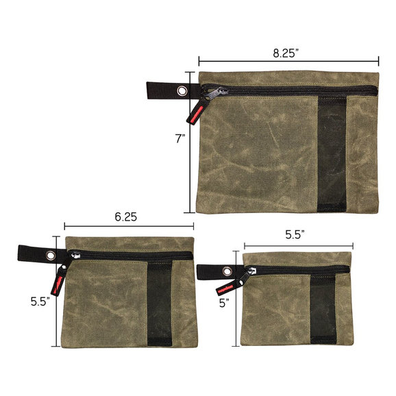 Keeping all of your supplies organized and protected can be a challenge for Jeep adventurers and outdoor enthusiasts short on storage space. Made to withstand rough and tumble use, Overland Vehicle Systems Canyon Bag Small Storage Organization Totes are handcrafted from premium cotton then infused with Parrafin wax for maximum durability with a handsome timeless patina that develops over time as you use and abuse these heavy construction organizing pouches. With heavy-duty zippers, mesh window access for identifying contents you've stowed, Small Canyon Bag, set of three are also equipped a heavy-duty metal grommet for hanging your bags at your campsite. Canyon Bags are the perfect way for campers and Jeep explorers to keep your provisions, neat, organized, and more importantly protected from the elements or all your cumbersome trail tools in your cargo hold. See OVS's entire Canyon line of waxed canvas bags and totes for the ultimate in space savings for your most essential preparedness equipment.