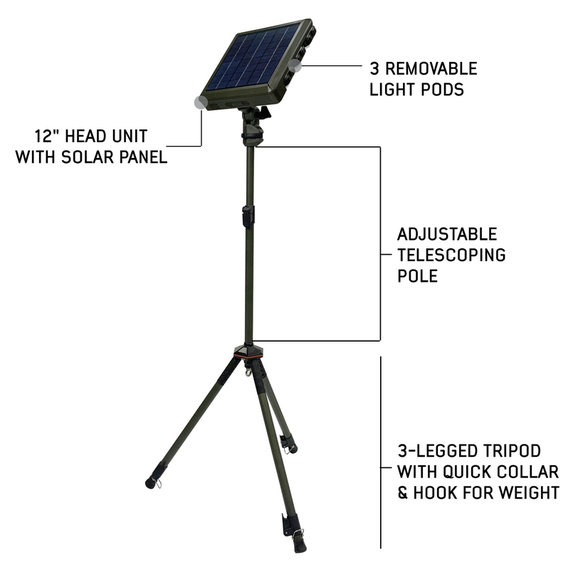 The Encounter Solar Powered Camp Light will become a permanent fixture for any campsite, tailgate, or outdoor activity. This feature-packed light system has a telescoping base that can be adjusted from 70" to 90" quickly and easily to light up any area you need. The incorporated Lithium-Ion battery can be charged with the 12" solar panels, or plugged into a power source with the integrated USB port. The main head unit features 3 removable LED light pods that recharge while attached to the head unit. The entire system is designed to be a portable power source, capable of charging your phone, laptop or any portable device while you are out exploring the terrain. The tripod base and telescoping poles are manufactured from high-qulity aircraft-grade aluminum that collapse and can be easily packed up into the included carrying case.