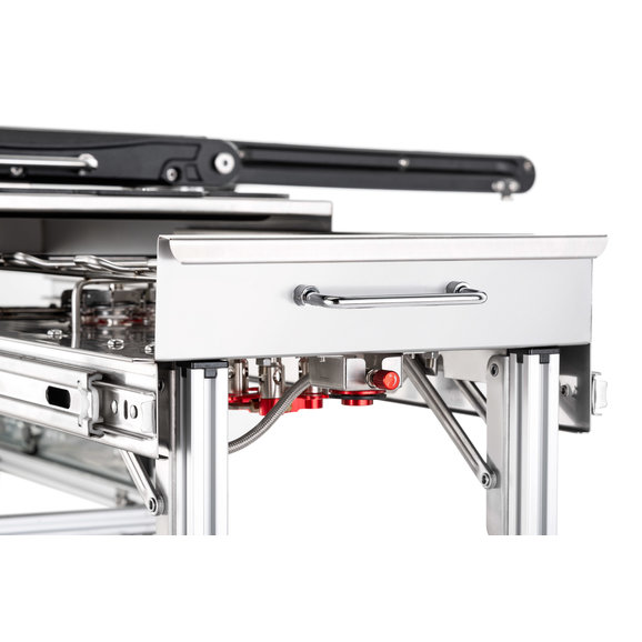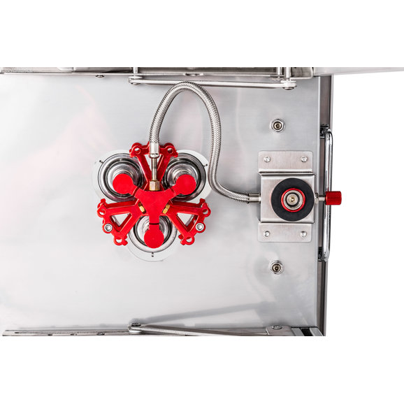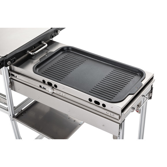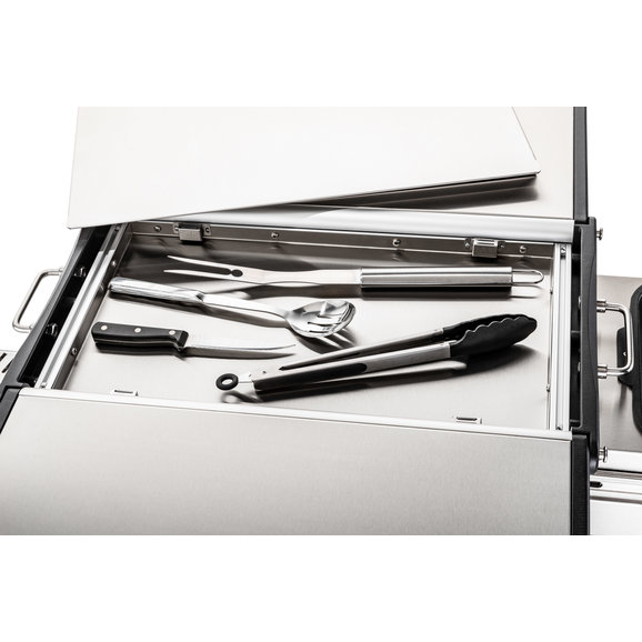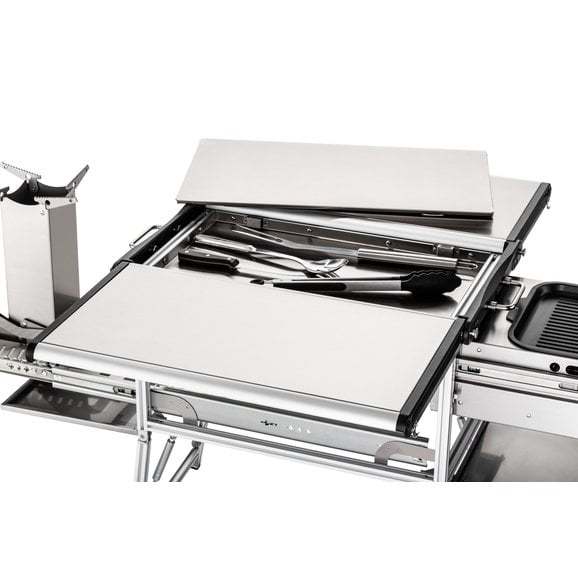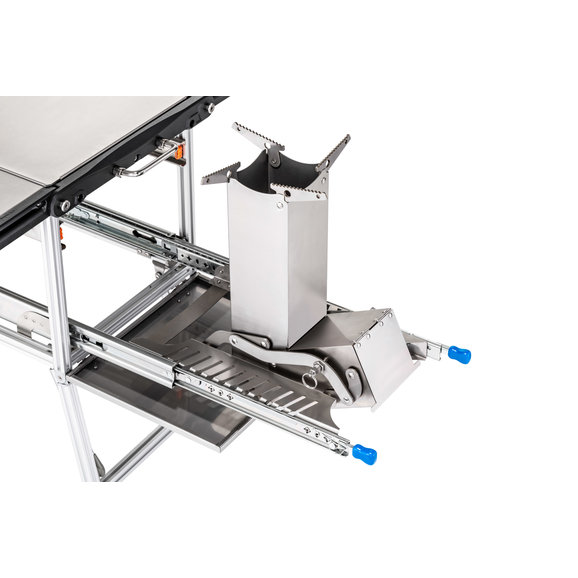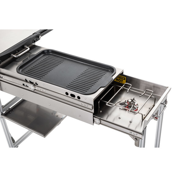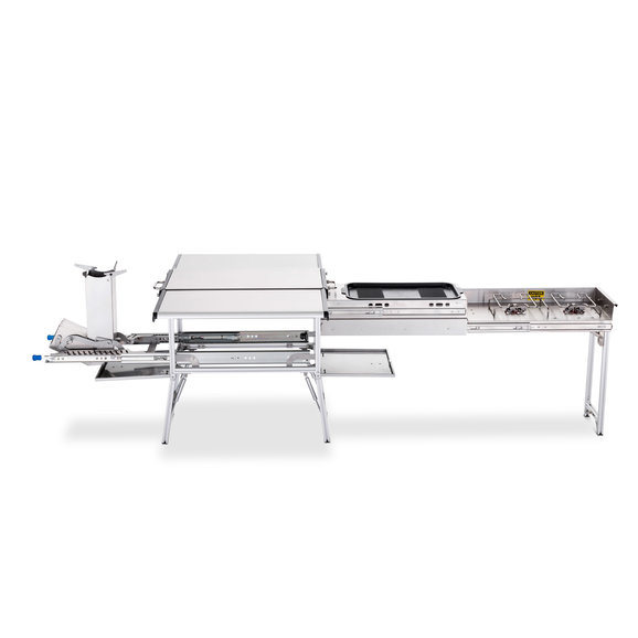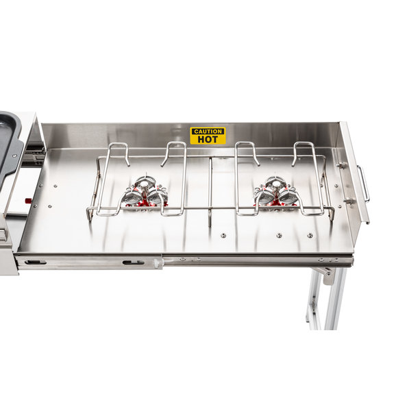 Functional: This offers the very best in cooking stations with dual propane grill burners & a skillet for you to cook your meals on. The Rocket Tower burner can be filled with charcoal or wood chips giving you an additional cooking space. The versatile table can be used to prep your meals or serve them as well.