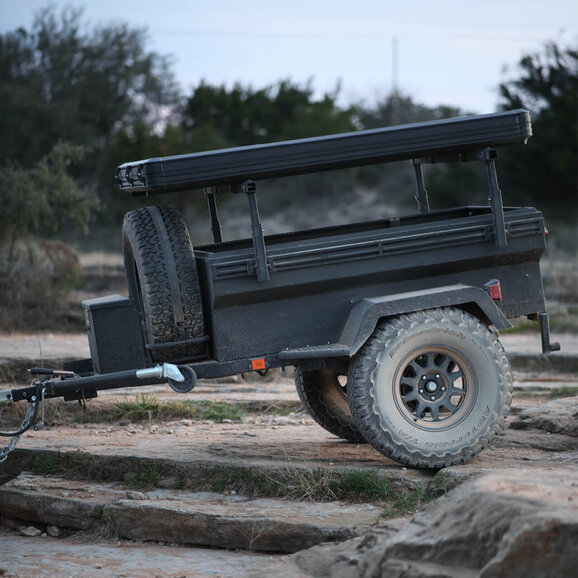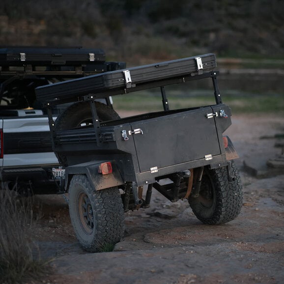 The all-new Overland Vehicle Systems Off-Road Trailer is built for adventure. Inspired by military trailers, it has a fully articulating suspension to conquer tough terrain and can be used as a utility trailer, motorcycle carrier, or a comfortable camping base. Made from alloy steel with a durable powder coat finish, it can handle anything you throw at it. This trailer boasts impressive ground clearance and features like a spare tire mount, electric brakes, and stainless steel hardware for maximum functionality and longevity. With endless customization options, this trailer is your ticket to unforgettable adventures.