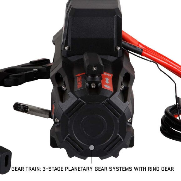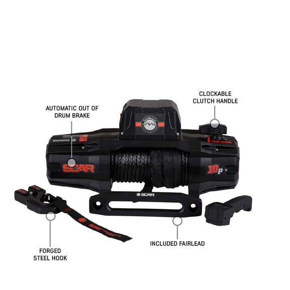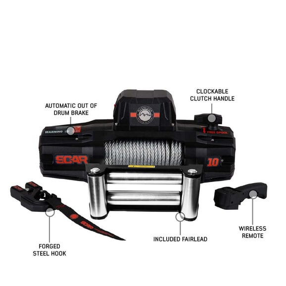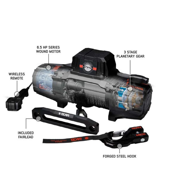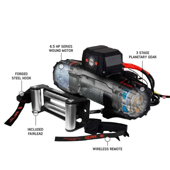 Get peace of mind and the power to pull through any challenge with the Overland Vehicle Systems S.C.A.R. Winch. This 12-volt off-road electrical winch is specifically designed to help your Jeep tackle tough terrain & rescue you or other vehicles out on the trails from tricky situations, like mud, sand, or snow. Featuring a 6.5hp series wound waterproof motor & a 3-stage planetary gear systems with ring gear making recovery smooth & fast. This winch comes with an wireless remote, aluminum hawse fairlead or 4-way roller fairlead & is available in 10k and 12k pull ratings. Features a limited lifetime warranty on mechanical parts and seven-year warranty on electrical components.