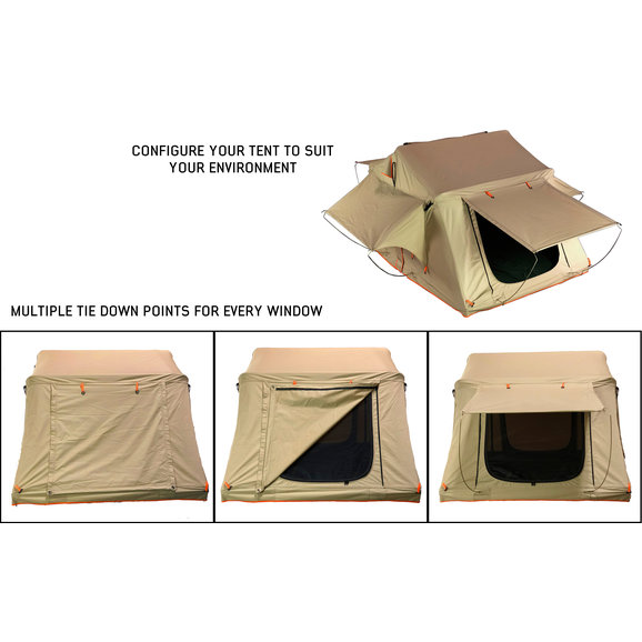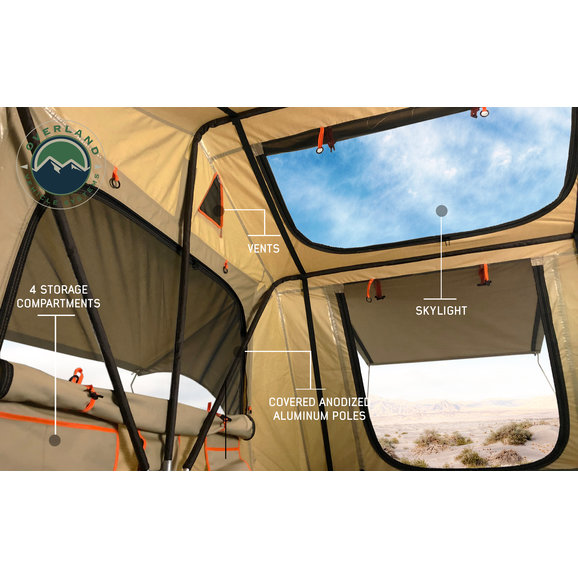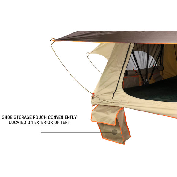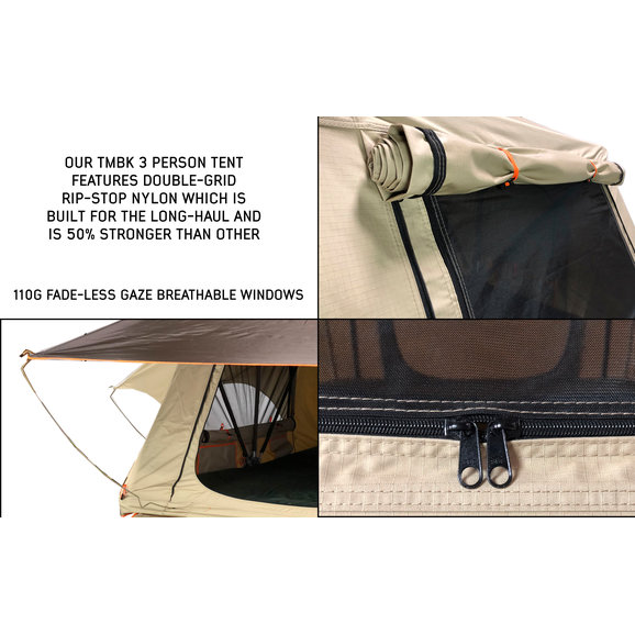 No need to book a hotel room or sleep on the ground during your next off-roading adventure with the TMBK 3 Roof Top Tent from Overland Vehicle Systems. This rooftop tent is made from high-strength marine-grade 280gs rip-stop waterproof cotton canvas material. The insulated tent base features a welded one-piece frame with stainless steel hinges that are meant to last! Sleep three people comfortably on the included 2.5” high-density foam mattress. The mattress includes a washable cover, so all you need is a sleeping bag and you are ready for rest. Enjoy the open air with the built-in skylight and all windows are equipped with fadeless gaze breathable mesh windows that easily zip open or closed. Keep your muddy trail shoes on the outside of the tent with the included shoe storage bag that attaches conveniently to the base of the tent. Attach the tent easily to most aftermarket racks. If bad weather hits, simply attach the 420D polyester oxford waterproof rainfly to keep you dry. When you are ready to head back out, the tent collapsed easily and is stored securely with the included heavy-duty 550g PVC travel cover. All of the necessary hardware is included for a simple no-hassle installation to most roof racks.